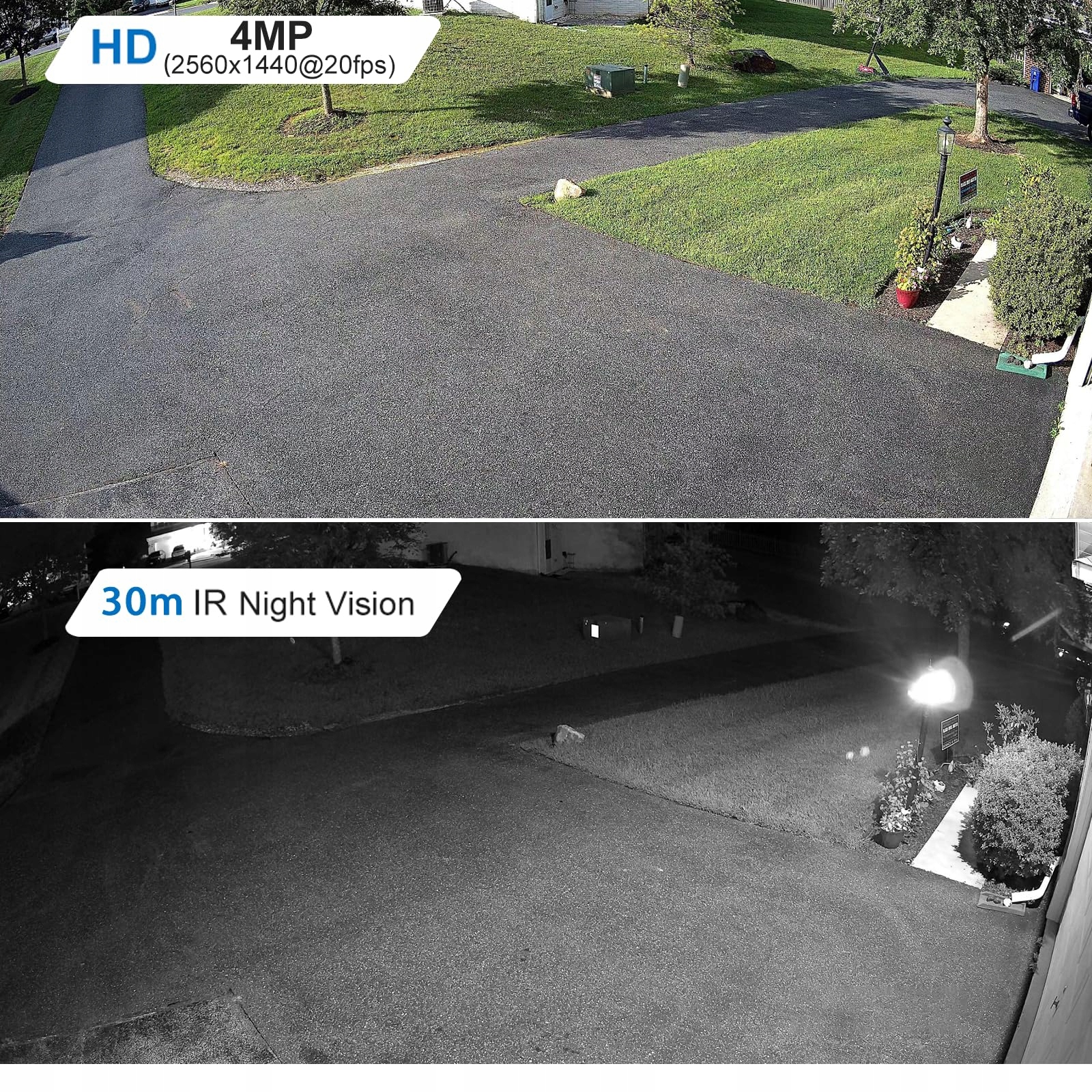 4MP HD IR noktowizor IP PoE kamera: zasięg noktowizora IR 20-30M, obiektyw 2,8 mm, szeroki kąt 110°, diody IR LED, aby osiągnąć niesamowity zasięg noktowizora. 4MP (2560x1440@25fps) PoE kamera z nagrywaniem audio do użytku wewnątrz lub na zewnątrz. Uwaga: wbudowane audio, z mikrofonem, bez głośników. nie jest kamerą PTZ, brak slotu na kartę SD, bez zasilacza.
