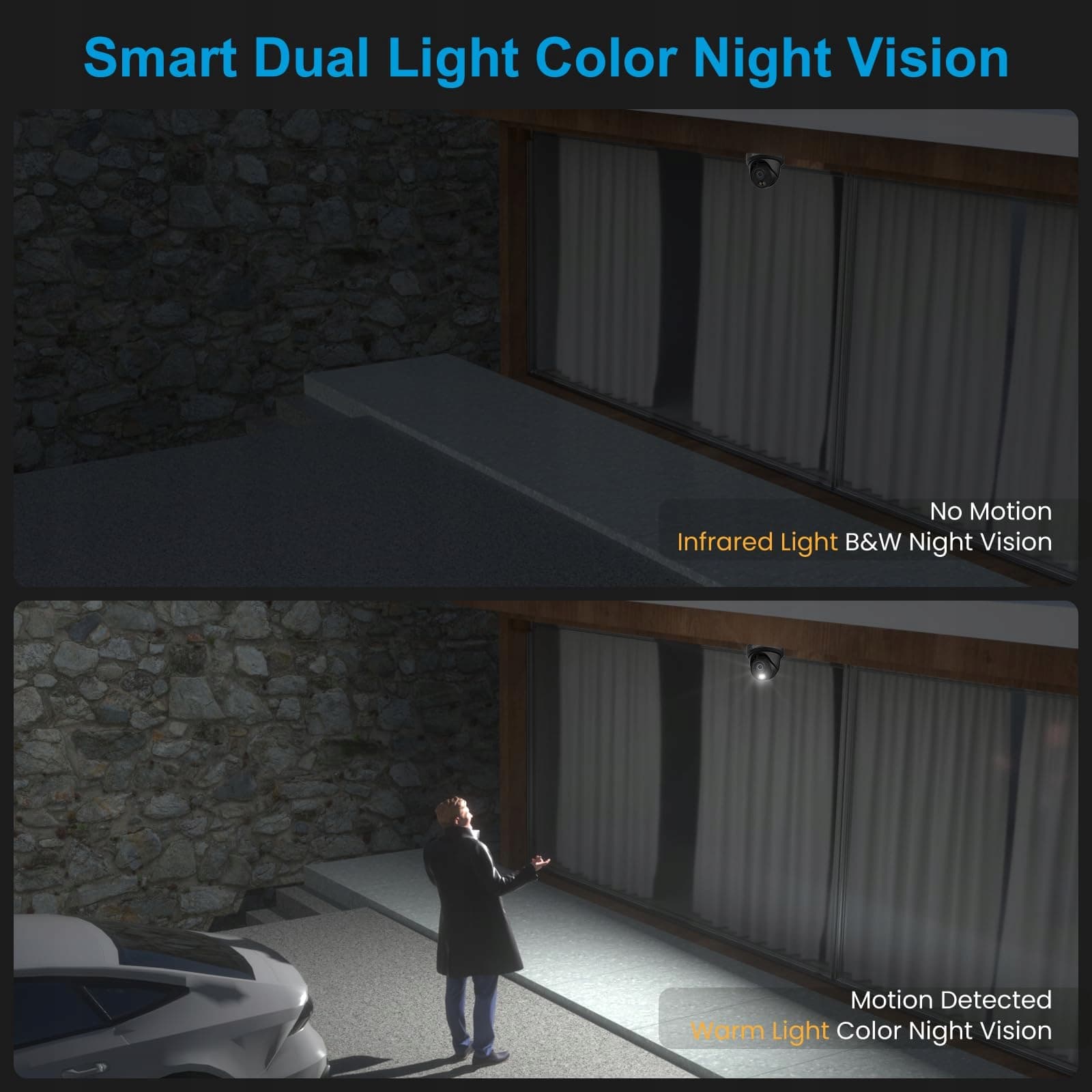 Inteligentne podwójne oświetlenie do widzenia nocnego: Ta 8MP PoE kamera IP na zewnątrz jest wyposażona w dwa ciepłe światła pod obiektywem, które zapalają się, gdy w nocy wykrywane są osoby lub pojazdy, dostarczając wyraźny i kolorowy obraz z ulepszonymi detalami. Możesz również dostosować tryb widzenia nocnego do swoich specyficznych potrzeb, wybierając pomiędzy trybem IR a ciągłym kolorowym widzeniem nocnym.