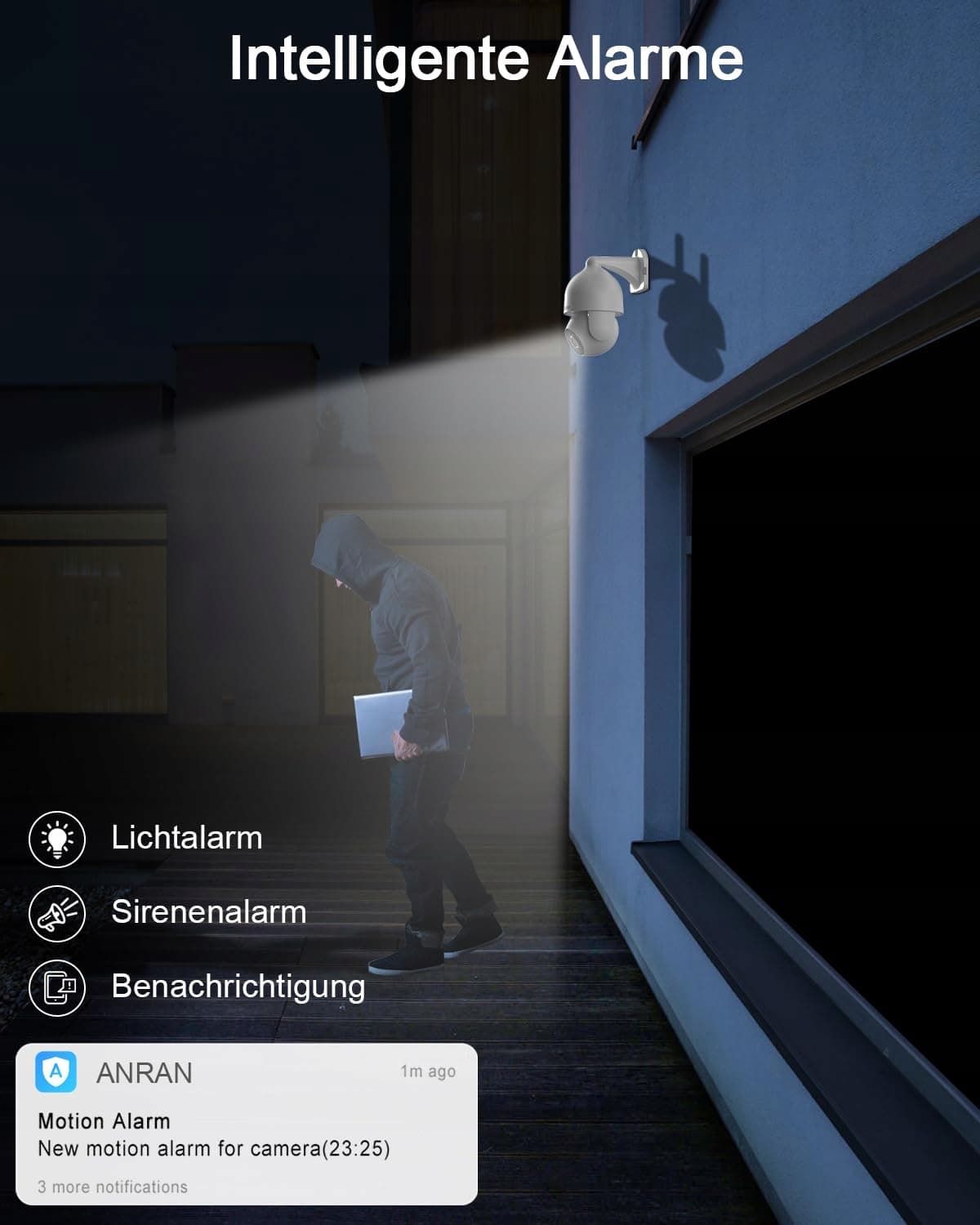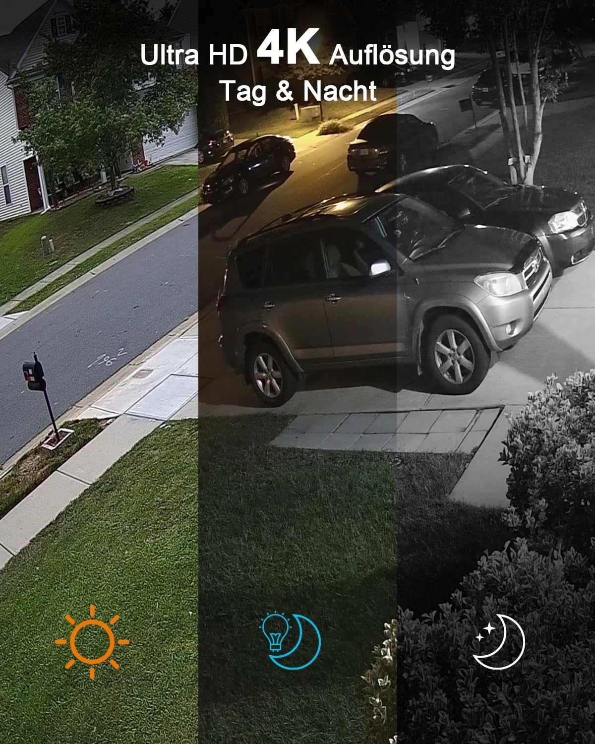 𝟰𝗞 𝗨𝗹𝘁𝗿𝗮 𝗛𝗗 𝗥𝗼𝘇𝗱𝗶𝗲𝗹𝗰𝘇𝗼𝘀́𝗰 & 𝗞𝗼𝗹𝗼𝗿𝗼𝘄𝗲 𝗪𝗶𝗱𝘇𝗲𝗻𝗶𝗲 𝗻𝗮 𝗰𝘇𝗮𝗿𝗻𝗼: Kamera może nagrywać filmy HD o rozdzielczości 3840 * 2160 pikseli, co odpowiada czterokrotności HD przy 2 MP. Dzięki temu możesz wyraźnie zobaczyć każdy szczegół na nagraniu. Ponadto kamera posiada białe światło, które można włączyć także w nocy, aby łatwo przełączać się między czarno-białym a kolorowym widzeniem nocnym.