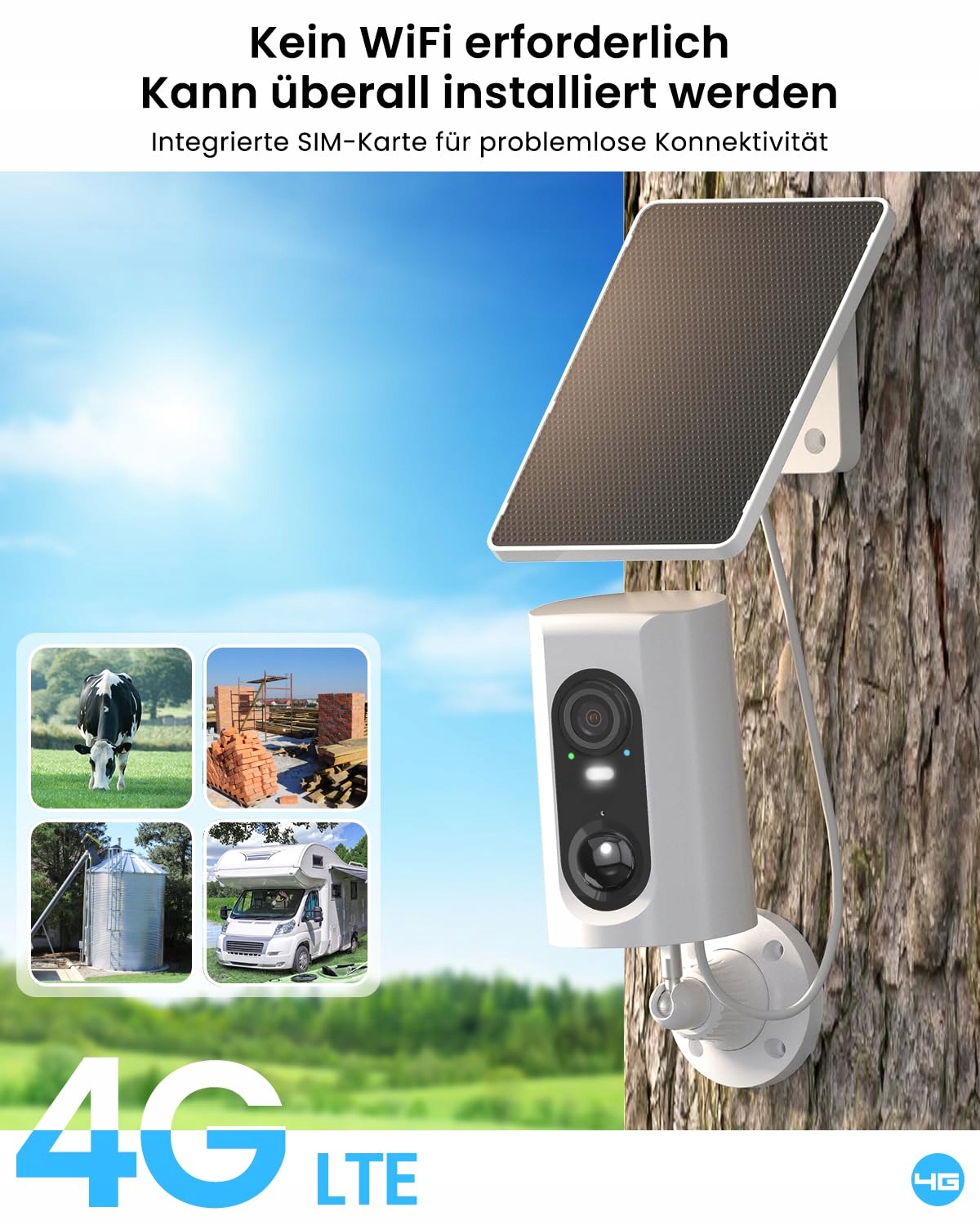 4G LTE i zasilanie solarne – 100% bezprzewodowa i samowystarczalna: całkowicie niezależna dzięki wbudowanemu połączeniu 4G LTE (z stałą kartą SIM) oraz wydajnemu panelowi solarnemu. Idealna do miejsc bez Wi-Fi lub zasilania – kamera działa wszędzie i sama się zasila.