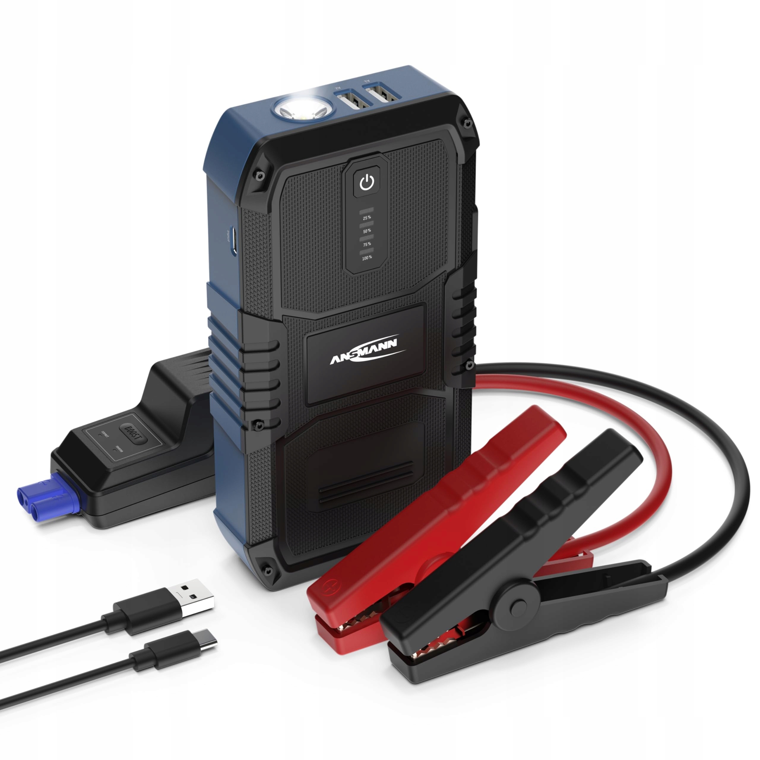 ZESTAW ZAWIERA: rozrusznik, kable rozruchowe, kabel ładujący USB-A na Typ C, etui, instrukcję obsługi