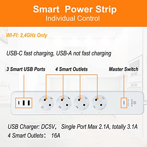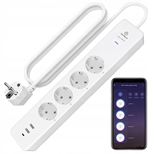 ANTELA WLAN listwa zasilająca Alexa z pomiarem energii, wielokrotne gniazdko z ochroną przeciwprzepięciową, funkcja timera, 4 gniazdka, 3 porty USB, Google Home, zdalne sterowanie APP, 2,4Ghz, 16A