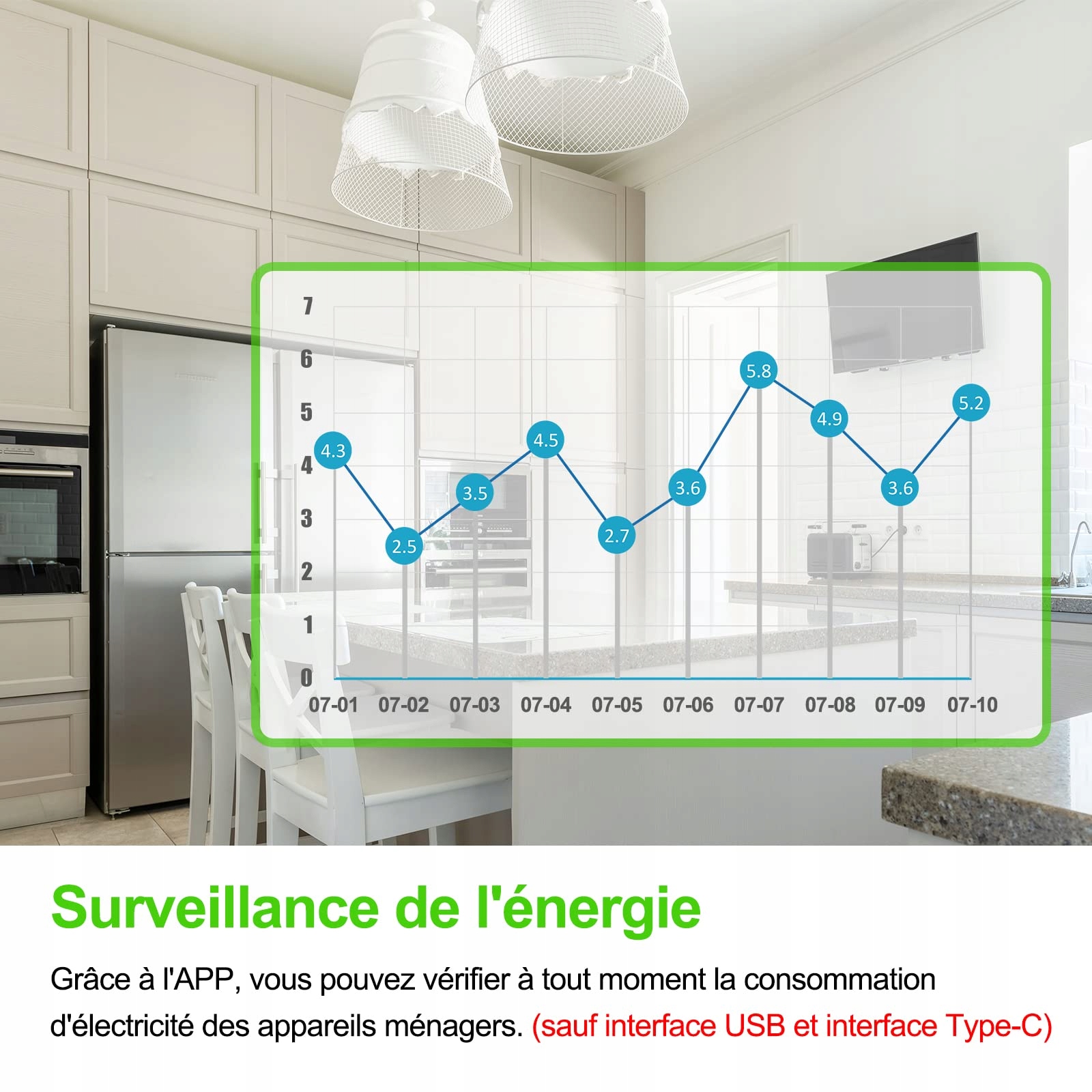 【Gniazdko WiFi z 2 USB i 1 Typ C】 To inteligentne gniazdko oferuje więcej funkcji i integruje wtyczkę oraz USB. Gniazdko: 110-240 V, 16 A. USB/Typ C: 5 V, 2,4 A.