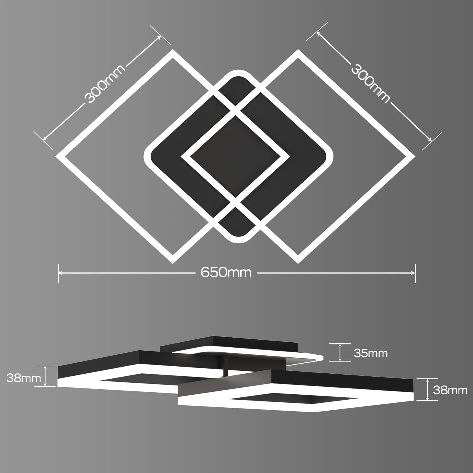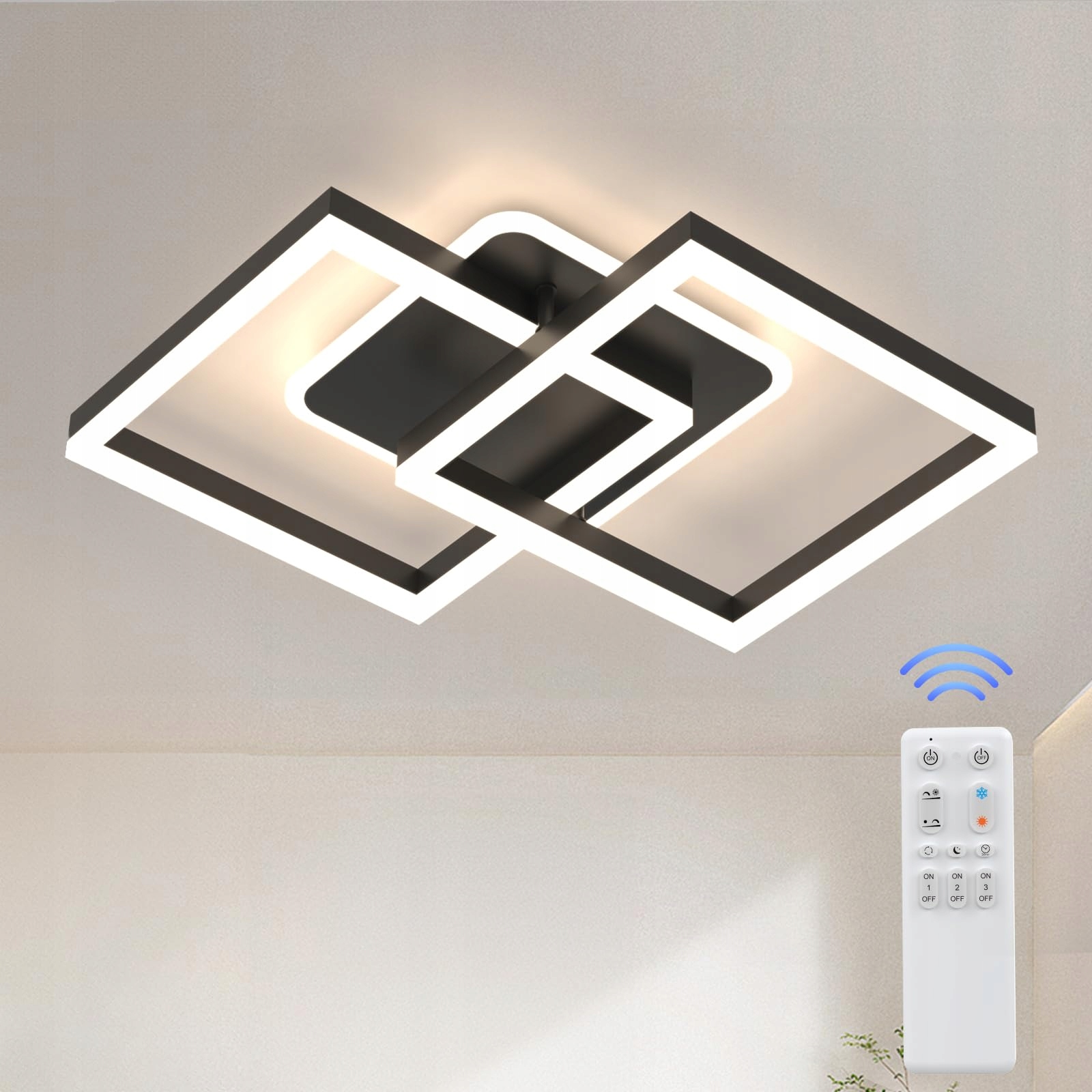 GEOMETRYCZNY DESIGN: Ta lampa sufitowa LED ma geometryczny design, który składa się z dwóch dużych, nachodzących na siebie kwadratowych ram oraz jednej małej kwadratowej ramy. Prosta konstrukcja nadaje lampie dynamiki i sprawia, że jest prawdziwą ozdobą.