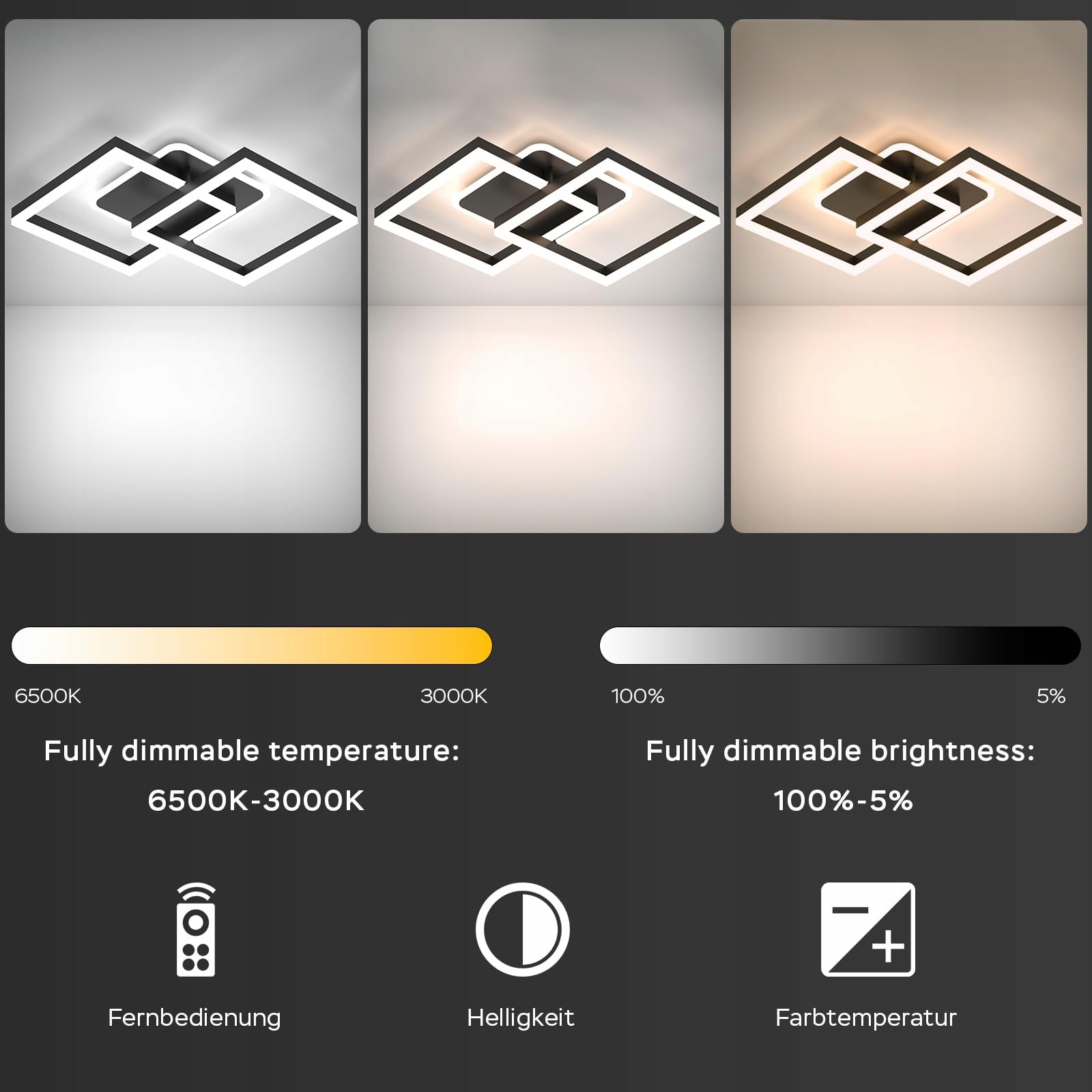 Z PILOTEM: Możesz bezstopniowo ustawić jasność od 10%-100% oraz temperaturę barwową od 3000-6500K za pomocą pilota zgodnie z Twoimi wymaganiami. (Uwaga: Nie ma możliwości indywidualnego sterowania trzema elementami lampy)