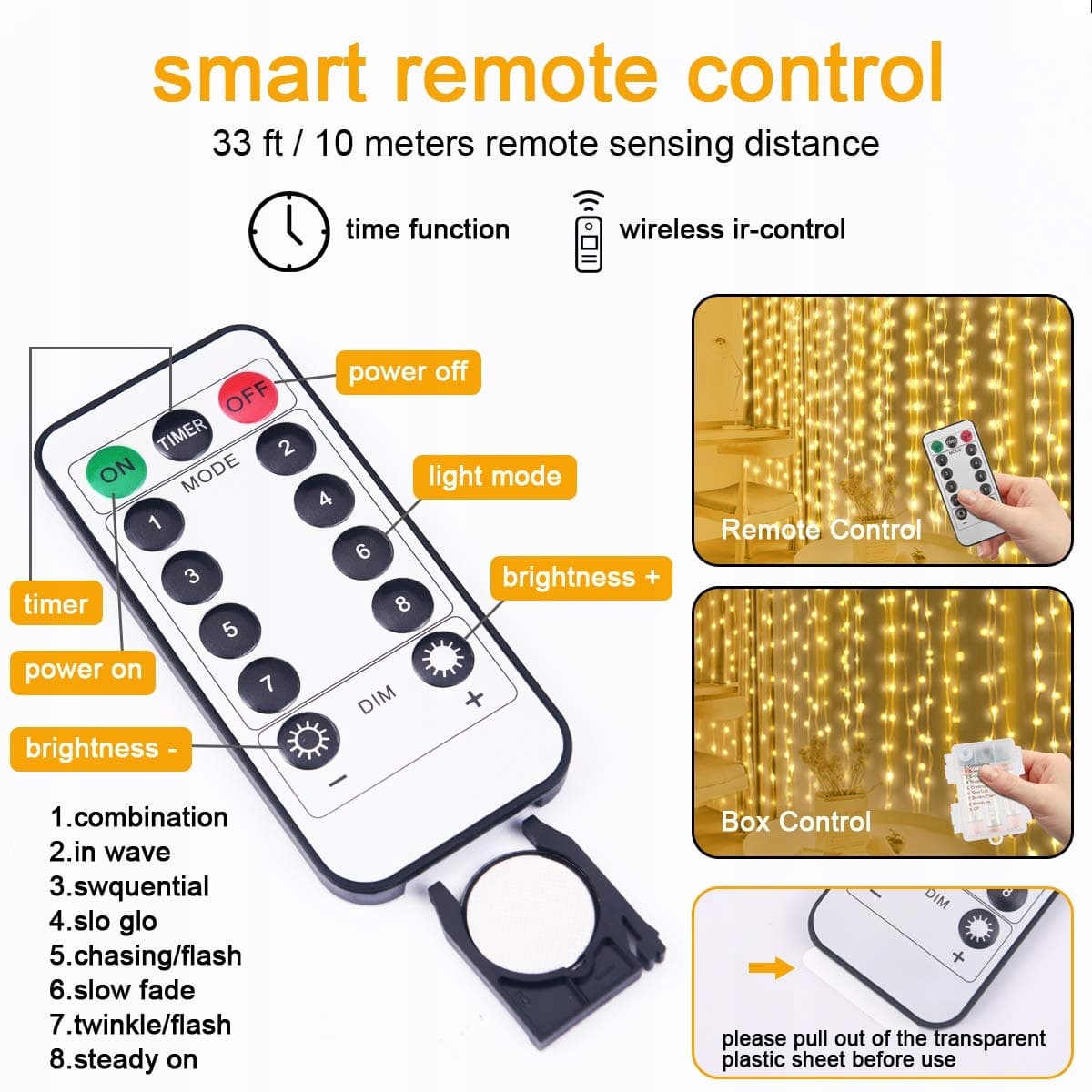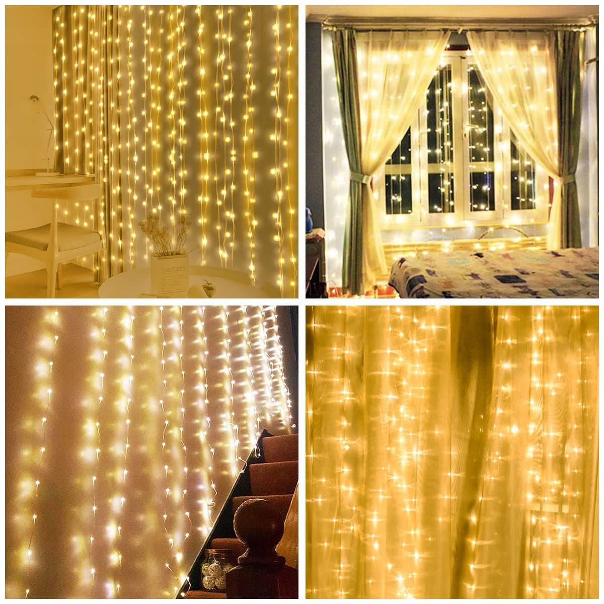 Aomig Kurtyna Świetlna 3x3m, Kurtyna Świetlna 2 w 1 USB & Bateria, LED Kurtyna Świetlna z 10 Hakami & Pilotem, 8 Trybów, IP65 Wodoodporna, Wewnętrzna Dekoracja Świąteczna, Ślub, Dekoracja Imprezowa - Ciepły Biały