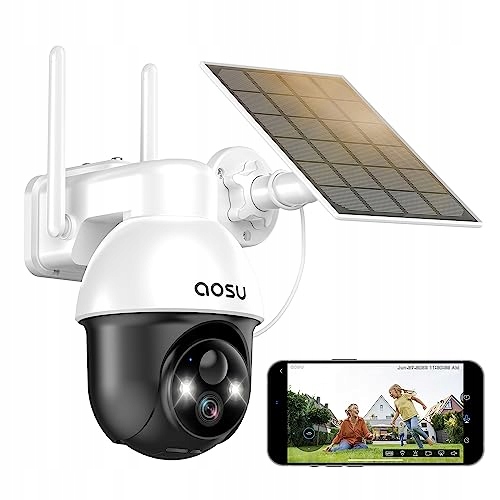 Kamera AOSU 2K Solar do monitoringu zewnętrznego z akumulatorem, kamera zewnętrzna z 360° monitorowaniem, automatycznym śledzeniem osób, kolorowym nocnym widzeniem do 10 m, alarmem świetlnym i dźwiękowym, dwu-kierunkowym audio, zdalnym podglądem