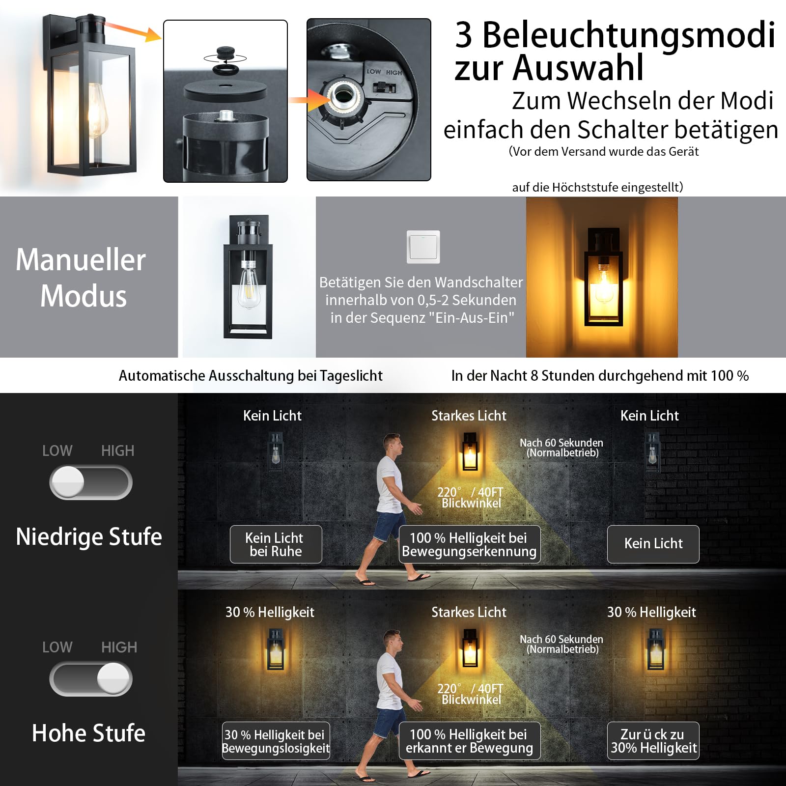 【Ekonomiczny tryb niski】Lampy zewnętrzne Aranzyec z czujnikiem oferują ekonomiczną opcję. Odkręć górną część lampy ściennej i przełącz tryb na 'LOW', aby aktywować tryb oszczędny. W tym trybie lampy zewnętrzne są całkowicie wyłączone, dopóki nie zostanie wykryty ruch. Po wykryciu ruchu przełączają się na 100% jasności i pozostają tak jasne, jak długo trwa ruch. Wyłączają się całkowicie, jeśli przez 1 minutę nie wykryją ruchu. Ten tryb pozwala zaoszczędzić dużo pieniędzy i jest bardzo łatwy w obsłudze.