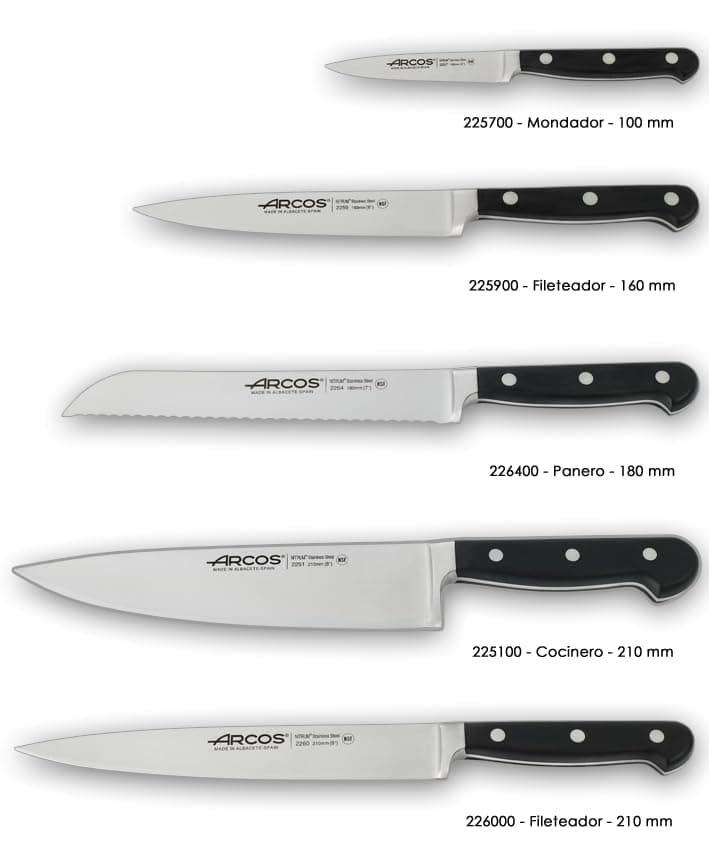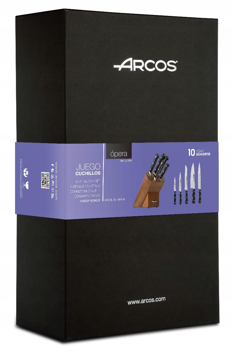 Arcos Opera - Zestaw noży kuchennych 5 sztuk (5 noży) - Stal nierdzewna Nitrum - Rękojeść POM - Blok z bukowego drewna lakierowanego orzechem