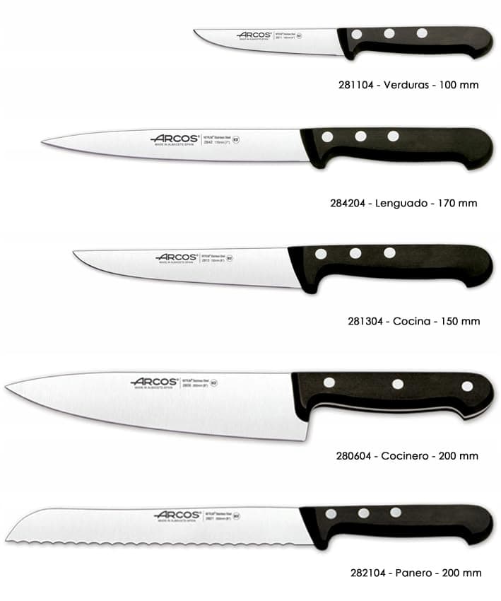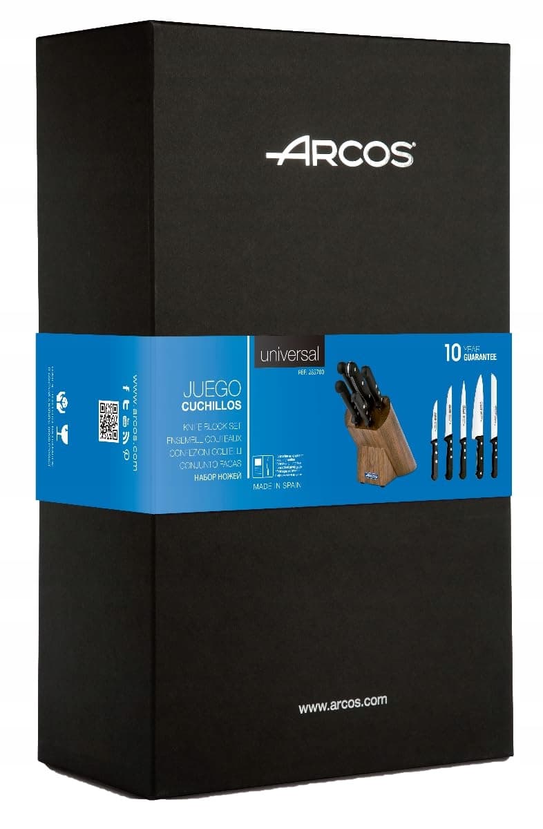 Arcos Seria Uniwersalna - Zestaw noży kuchennych w pudełku prezentowym 5 sztuk (5 noży) - Ostrze ze stali NITRUM - Rączka z polioksymetylenu (POM) - Blok z drewna sosnowego