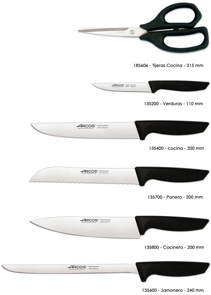 6-częściowy zestaw noży kuchennych serii Niza od Arcos obejmuje: nóż do warzyw (10 cm), nóż kuchenny (20 cm), nóż do chleba (20 cm), nóż szefa kuchni (20 cm), nóż do krojenia (23 cm) oraz czarne nożyczki kuchenne (20 cm). Noże i nożyczki charakteryzują się prostą formą i lekkością, a ekskluzywny materiał sprawia, że są szczególnie odporne i idealne do codziennego użytku.