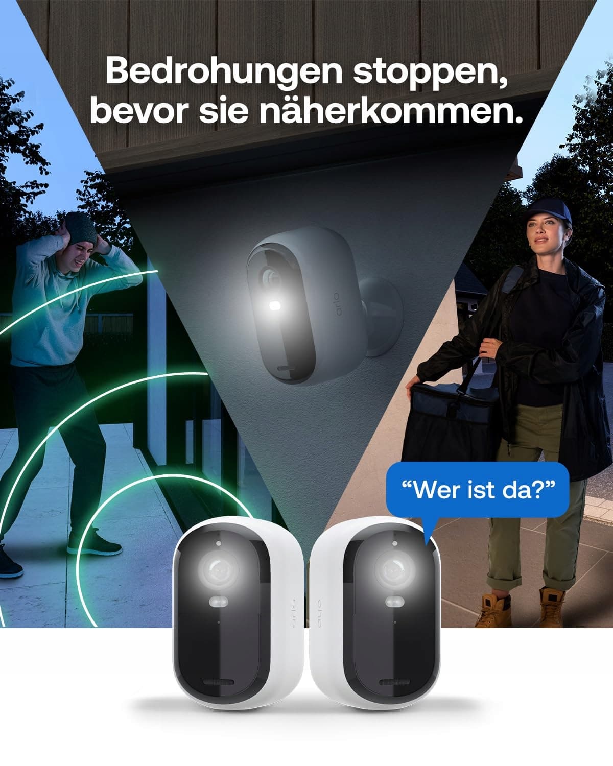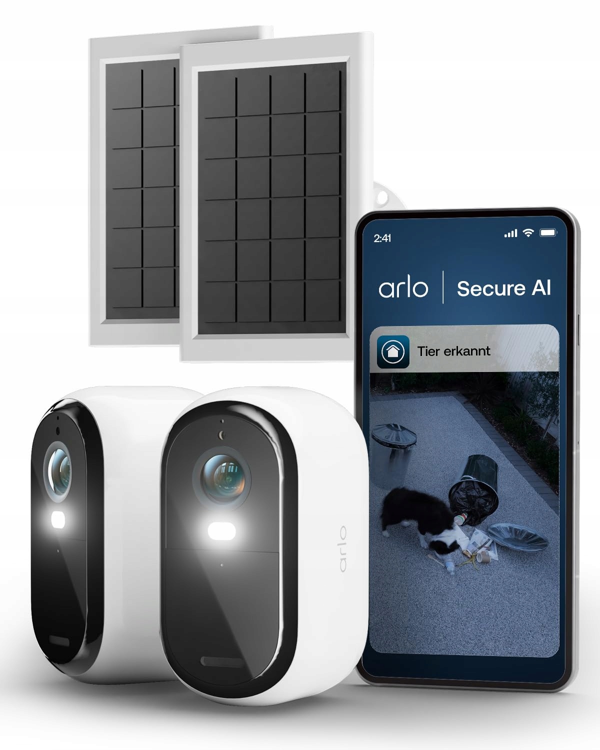 Arlo Essential 3 HD Kamera monitoringu zewnętrznego & 2X Solar, bezprzewodowa, wideo 1080p, kolorowa nocna wizja, światło, czujnik ruchu, syrena, dwukierunkowe audio, Smart Home + okres próbny planu Arlo Secure, zestaw 2 szt.