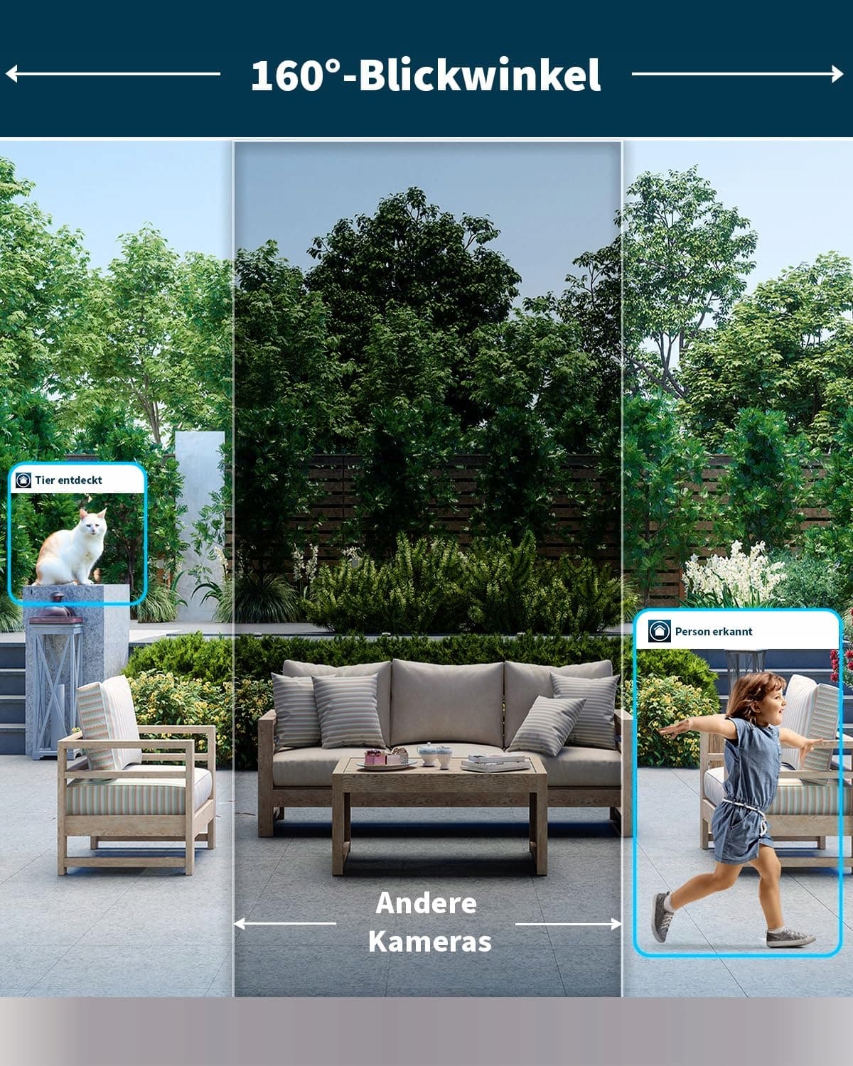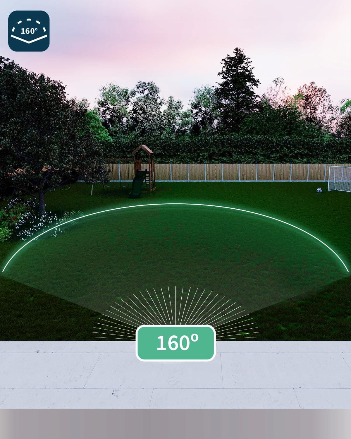 Szerokie pole widzenia - duży ogród? Długi podjazd? Dzięki szerokiemu polu widzenia 160° masz na oku obszary, do których inne kamery bezpieczeństwa nie docierają