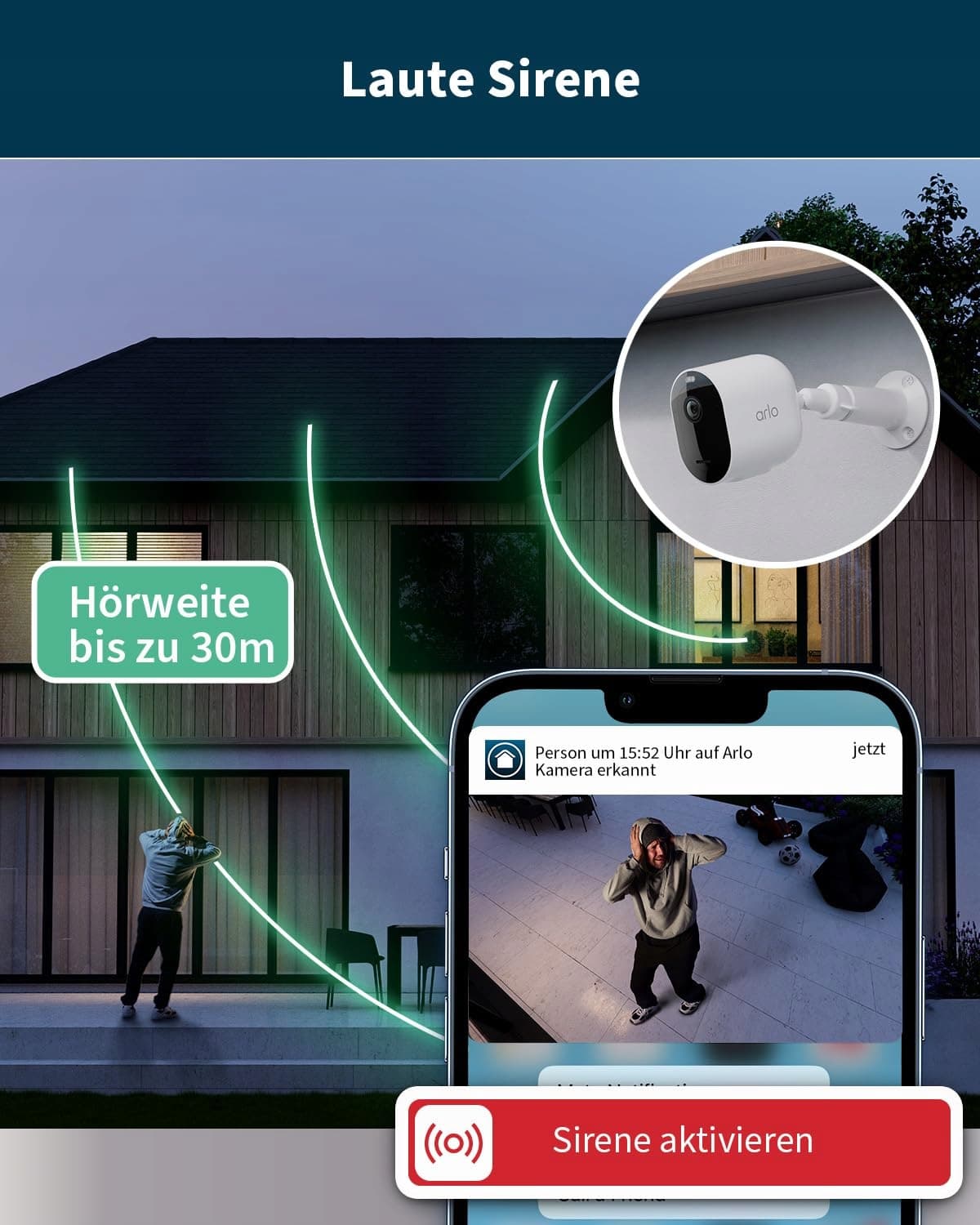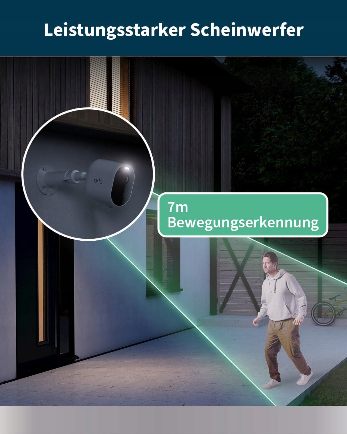 Arlo Pro 5 Kamera monitorująca na zewnątrz WLAN, wideo 2K+ HDR, bezprzewodowa, ulepszona kolorowa wizja nocna, kąt widzenia 160°, reflektor, dwukierunkowe audio, syrena alarmowa, okres próbny Secure, zestaw 4, biały