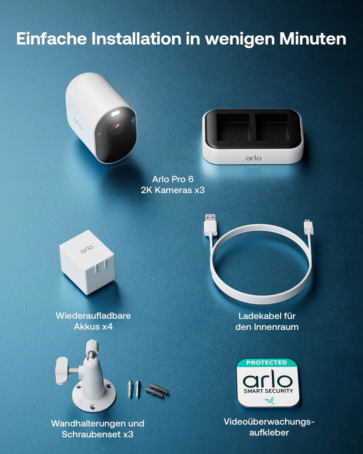 Arlo Pro 6 Kamera do monitoringu zewnętrznego WLAN, bezprzewodowa, 2K+HDR, kolorowe widzenie nocne, dwukierunkowe audio, wykrywanie ruchu, z okresem próbnym Arlo Secure, zestaw 3 sztuk z dodatkową baterią i podwójną stacją ładującą