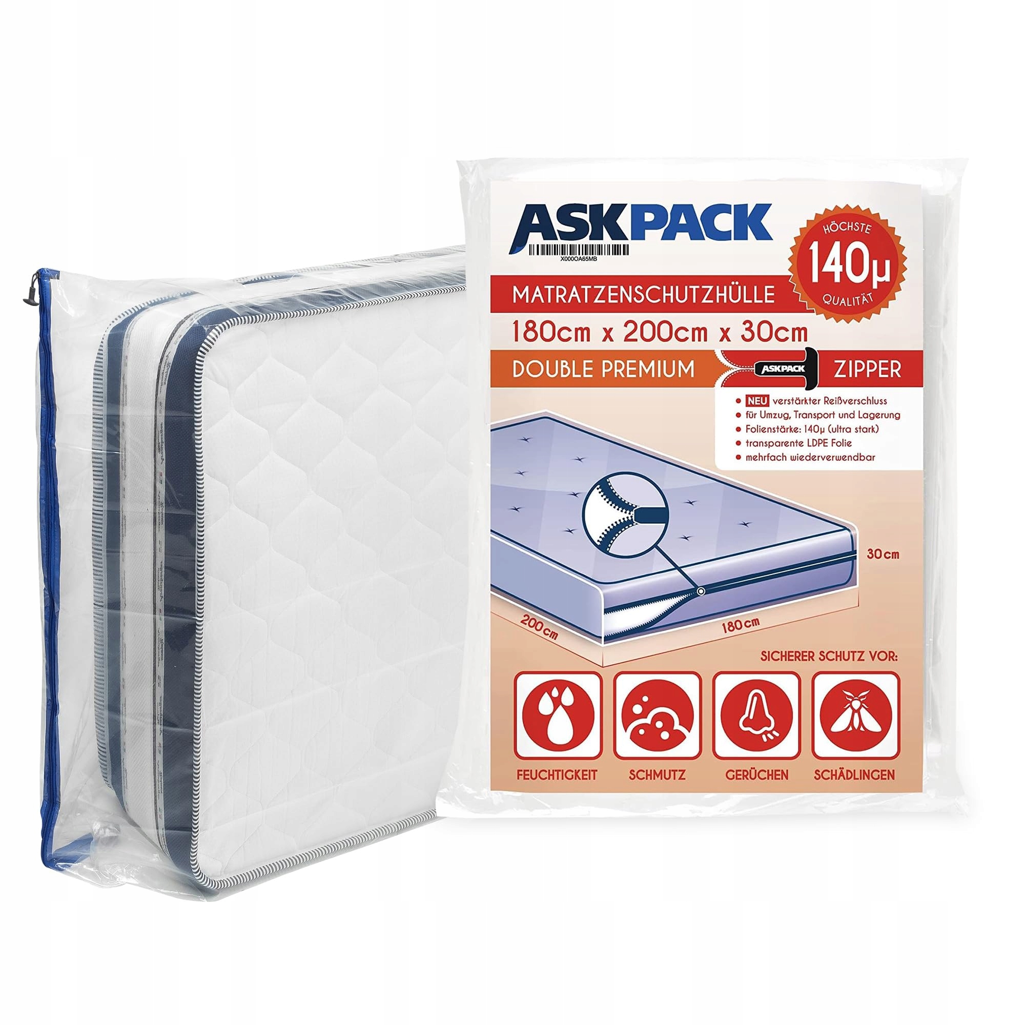 ASK Pack pokrowce na materace z zamkiem błyskawicznym Anker - rozmiary od XS do XXL, wodoodporne, odporne na rozdarcia, ultra mocny materiał 140 mikronów - idealne do przeprowadzki, przechowywania i transportu - 180x200 cm