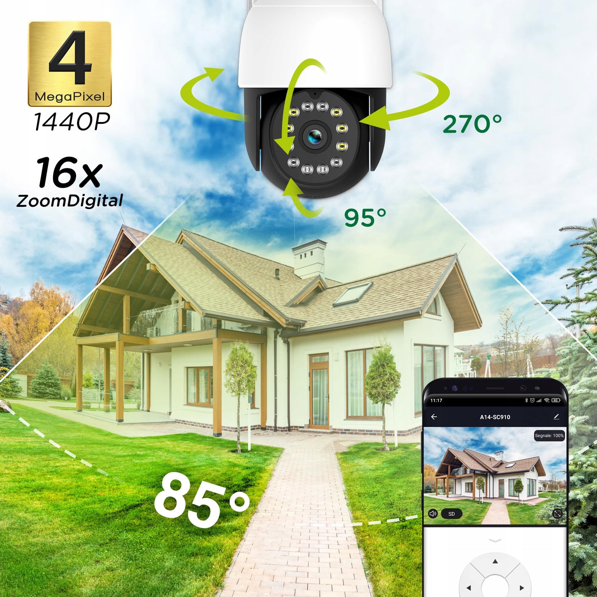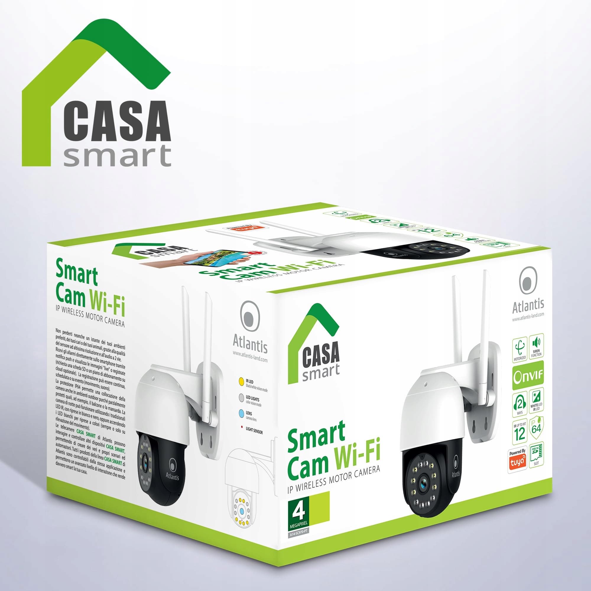 Atlantis 2K Bezprzewodowa Kamera Wi-Fi na zewnątrz, 4 Mpixel Full HD i sup: 2560x1440 lub 1920x1080 przy 25fps, Napęd, IP64, 6 IR i 6 białych diod LED zasięg 12m, Mikrofon, darmowa APLIKACJA, A14-SC970-PT