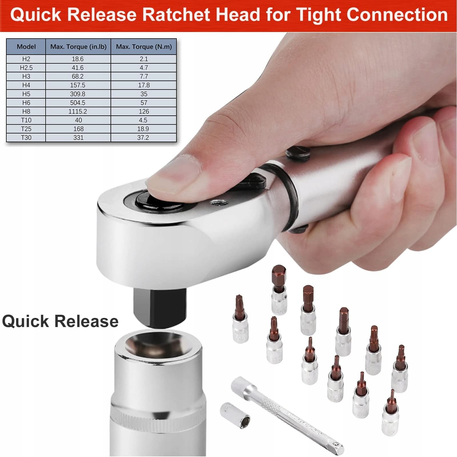 Zestaw kluczy dynamometrycznych (15 części): W tym Hex: H2, H2.5, H3, H4, H5, H6, H8, H10; Torx: T10, T25, T30; 1*10cm pręt przedłużający; 1*sprzęgło; 1* klucz dynamometryczny o wysokiej precyzji 1/4" (25cm); do dostępu do ukrytych śrub; ochronne, formowane etui zapewnia bezpieczne przechowywanie regulowanych kluczy dynamometrycznych i bitów narzędziowych, aby sprostać twoim potrzebom.