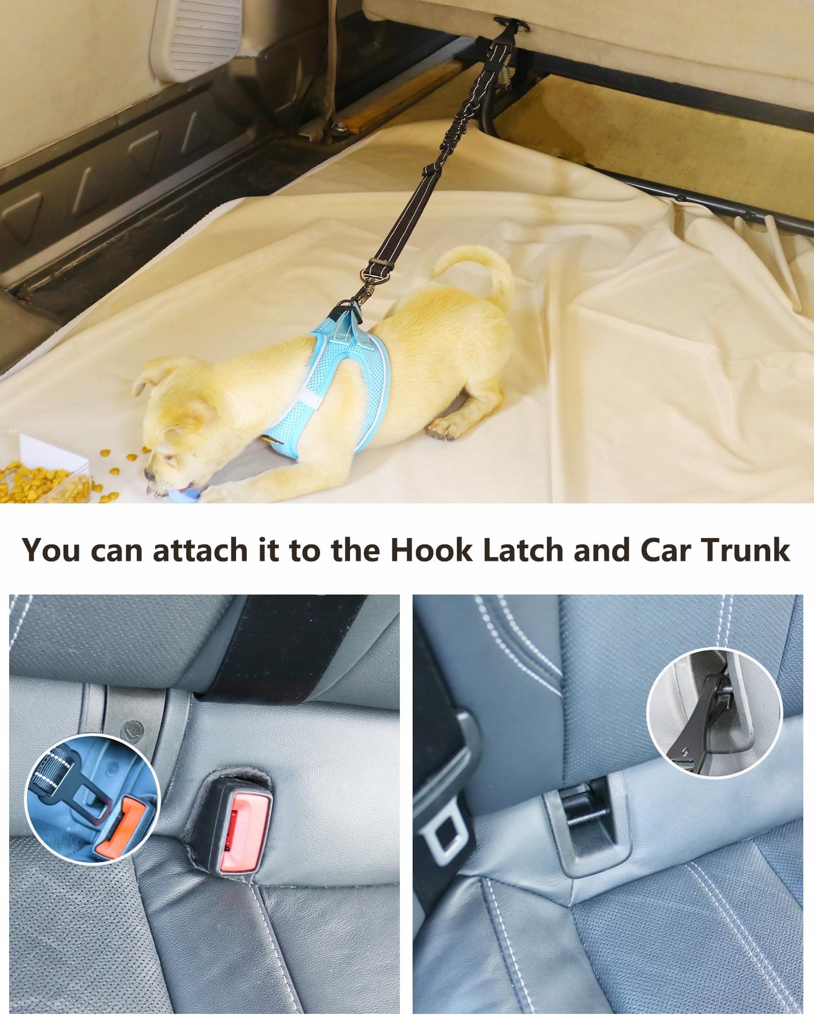 3-w-1 pas bezpieczeństwa dla psa: Nasz pas bezpieczeństwa dla psa jest wyposażony w 2 różne rodzaje klamer samochodowych. Oprócz standardowej klamry pasów bezpieczeństwa, jest on wyposażony w dodatkowy zamek hakowy, który można przymocować do fotelika dziecięcego i bagażnika. Możesz nawet połączyć dwa pasy w jeden, jeśli zapomnisz zwykłej smyczy