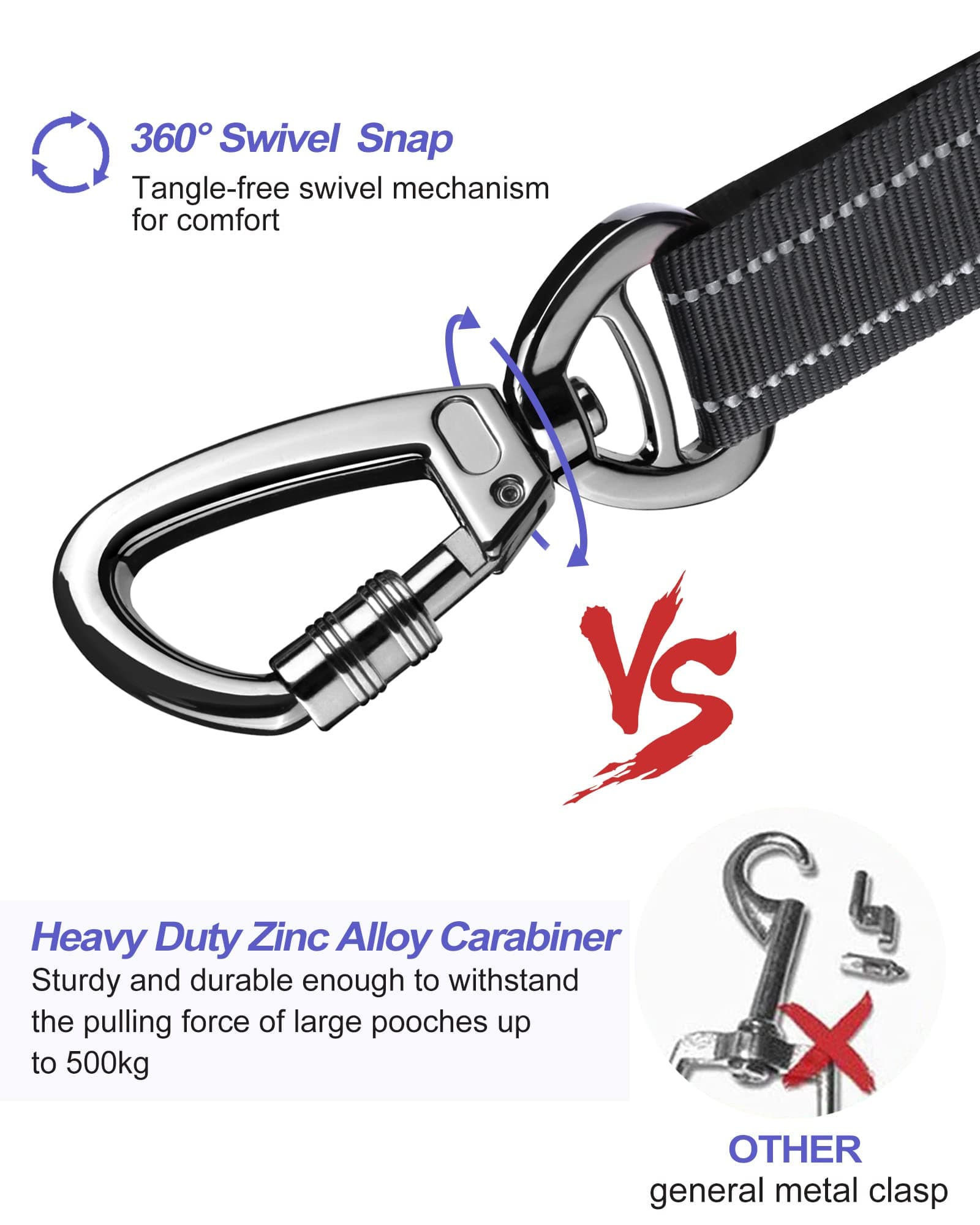 Obrotowy karabińczyk 360°: Nowy, ulepszony, podwójnie bezpieczny zamek karabińczykowy jest wykonany ze stali nierdzewnej. Wysokiej jakości obrotowy karabińczyk ze stopu cynku o maksymalnej wytrzymałości na rozciąganie 900 lbs może utrzymać psa stabilnie podczas jazdy samochodem, zwiększając bezpieczeństwo zwierząt podczas jazdy i zapewniając bezpieczeństwo kierowców. Obrotowy zamek o 360 stopni zapewnia, że Twój pies może swobodnie się poruszać, nie dusząc się ani nie plącząc