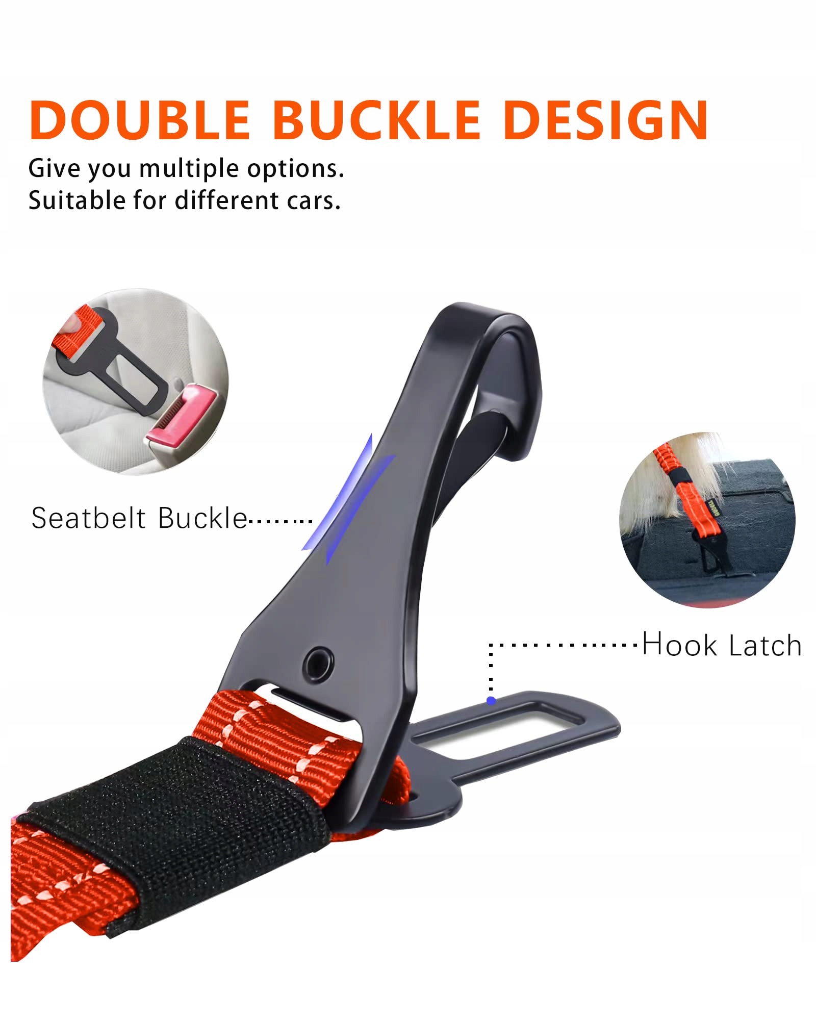 3-w-1 pas bezpieczeństwa dla psa: Nasz pas bezpieczeństwa dla psa jest wyposażony w 2 różne rodzaje klamer samochodowych. Oprócz standardowej klamry pasów bezpieczeństwa, posiada dodatkowe zapięcie na hak, które można przymocować do fotelika dziecięcego i bagażnika. Możesz nawet połączyć dwa pasy w jeden, jeśli zapomnisz zwykłej smyczy