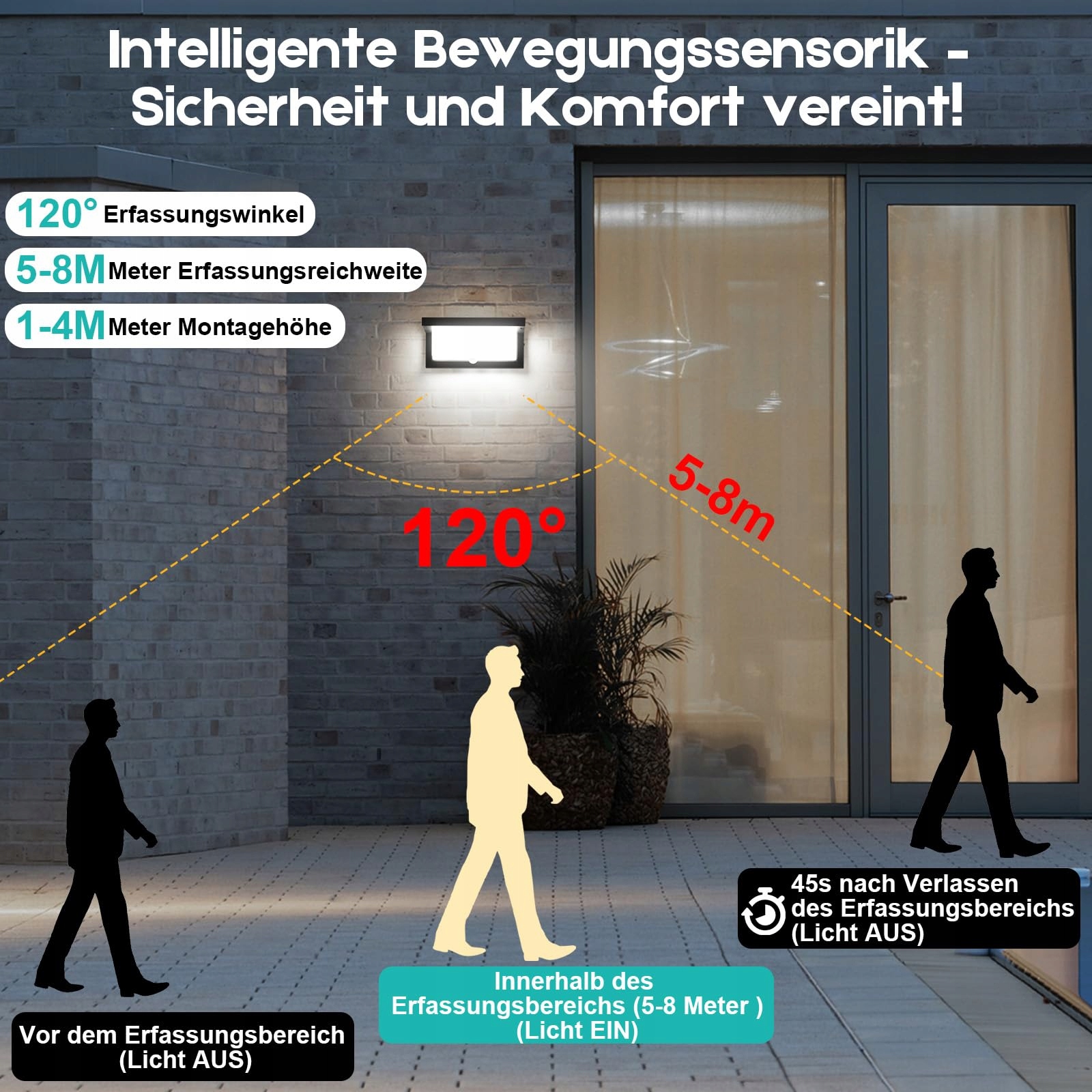 Inteligentna lampa zewnętrzna z czujnikiem ruchu: Lampa ścienna Audor 18W włącza się automatycznie w promieniu 3 metrów i wyłącza po 50 sekundach bez ruchu. Dzięki czujnikowi ruchu i podczerwieni wykrywającemu ciało ludzkie zapala się automatycznie, gdy ktoś przechodzi obok – dzień i noc. Dzięki temu nie trzeba ręcznie włączać światła. Funkcje te zapewniają nie tylko wygodę, ale także zwiększają bezpieczeństwo i oszczędzają energię.