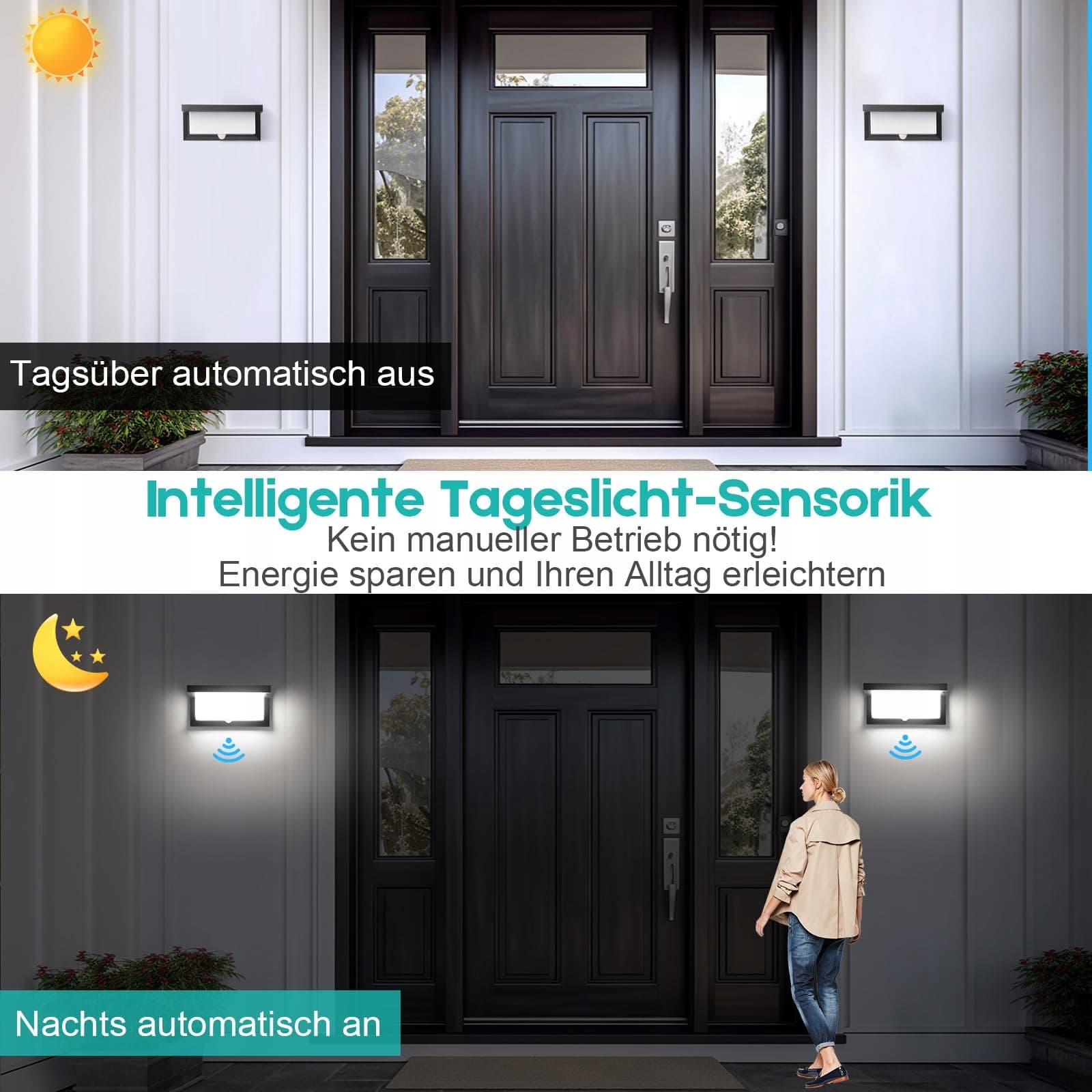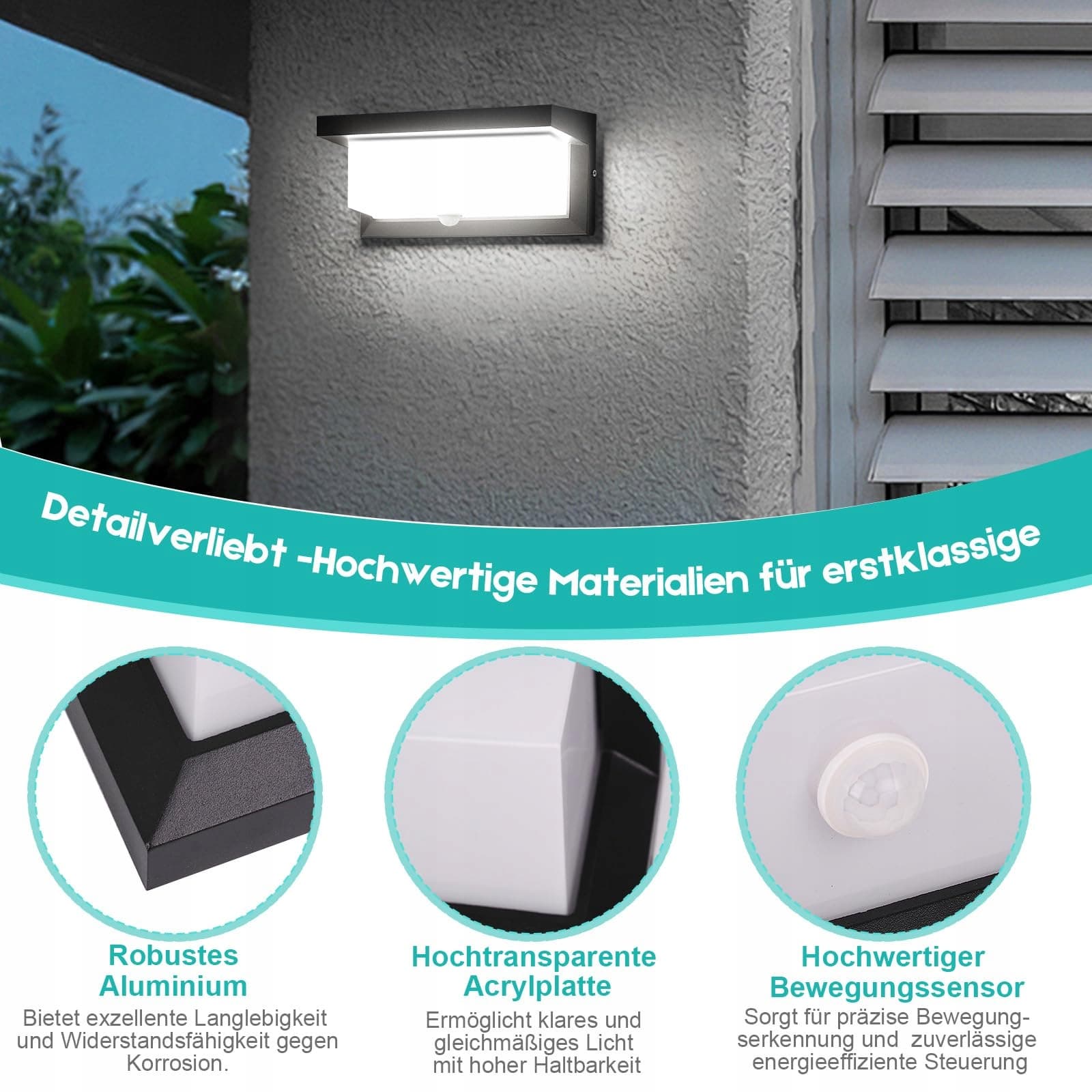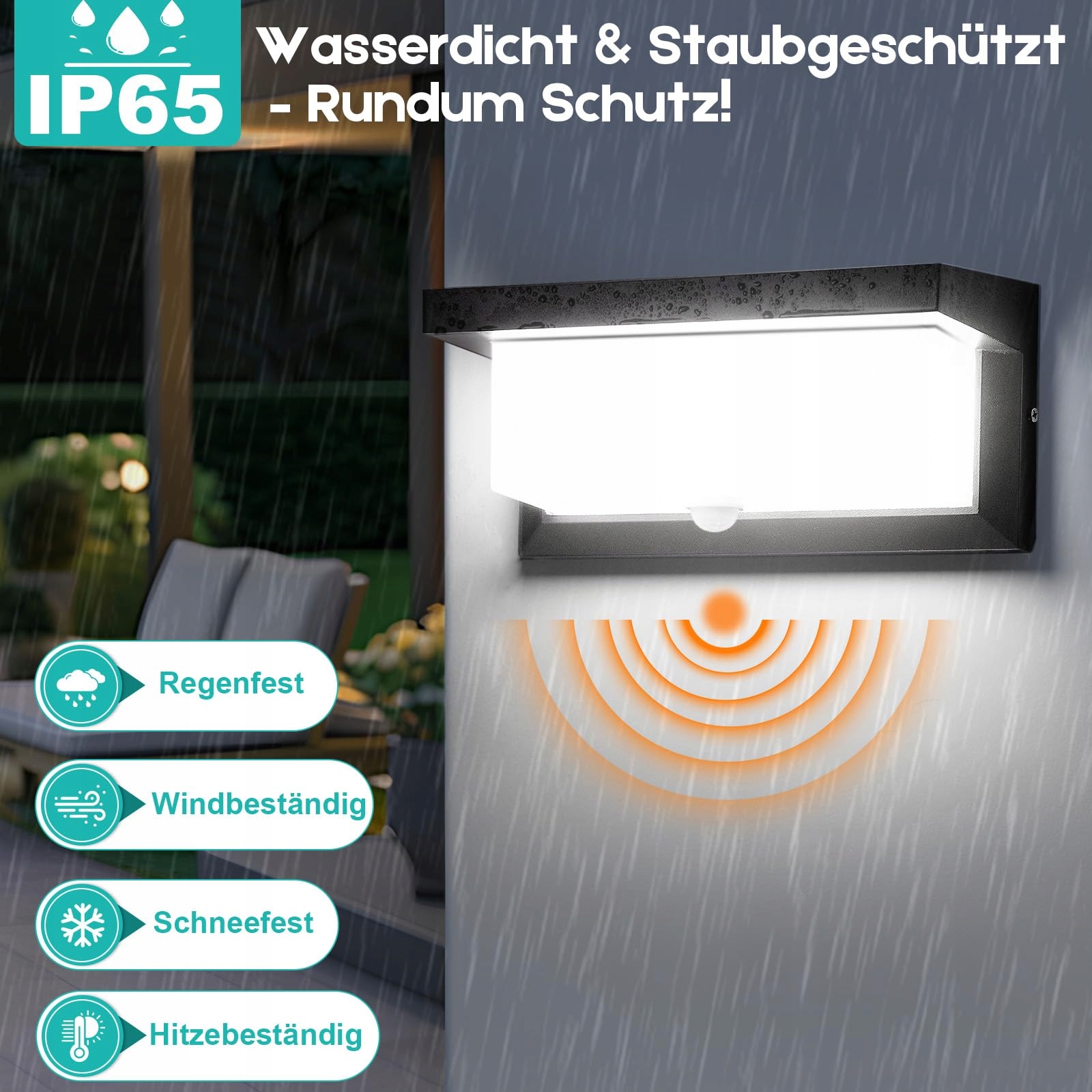 Odporna na warunki atmosferyczne konstrukcja do długotrwałego użytkowania: Dzięki klasie ochrony IP65 ta zewnętrzna lampa ścienna z czujnikiem ruchu jest całkowicie zabezpieczona przed kurzem i wodą. Nawet podczas silnego deszczu lub śniegu lampa zewnętrzna działa niezawodnie i bezpiecznie, co czyni ją idealnym wyborem do całorocznego użytku na zewnątrz. (Uwaga: lepiej montować ją w osłoniętym miejscu na zewnątrz, co wydłuży żywotność lampy).