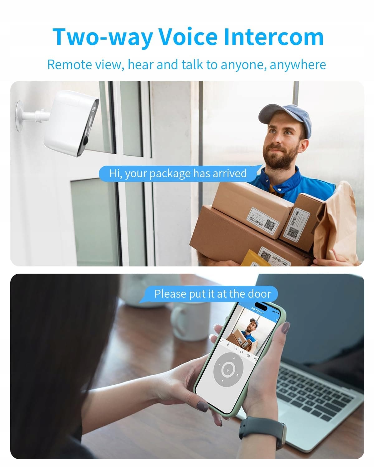 ●Dwukierunkowe audio do komunikacji w czasie rzeczywistym – Komunikuj się bezpośrednio z gośćmi, dostawcami lub potencjalnymi intruzami – wszędzie i o każdej porze.