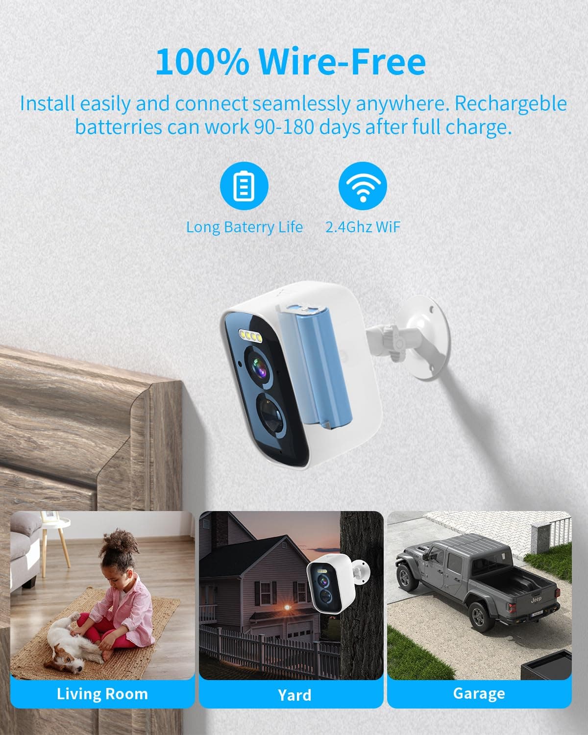 ●Bezprzewodowa praca na akumulator – Elastyczna i bez plątaniny kabli! Ta kamera monitoringu jest zasilana wytrzymałym akumulatorem, idealna do użytku wewnątrz i na zewnątrz.