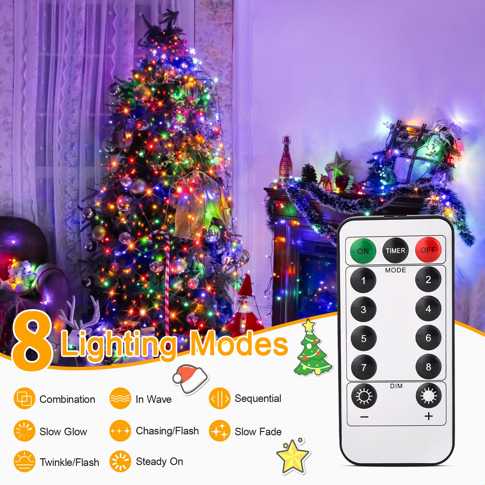 [8 trybów i 4 jasności] Oświetlenie choinkowe wewnątrz ma 8 trybów świetlnych: kombinacja/fala/sekwencja/wolne światło/pościg/wolne zgaśnięcie/błysk/stałe światło. 4 jasności 25%, 50%, 75%, 100%. Możesz wybrać światło i jasność zgodnie z wymaganiami podziału przestrzeni, aby stworzyć świąteczną atmosferę w swoim domu