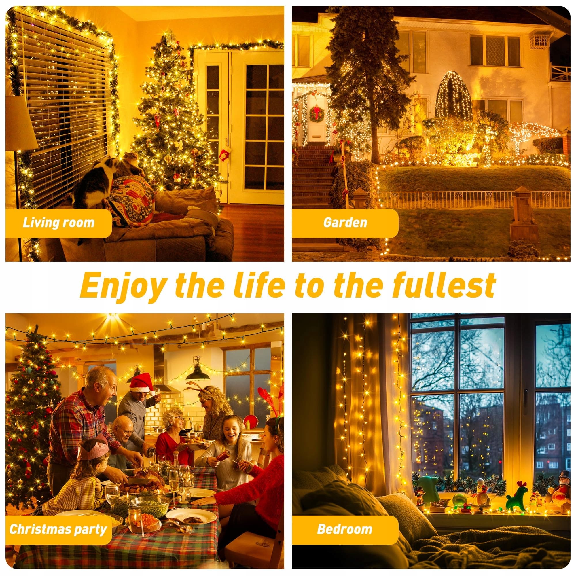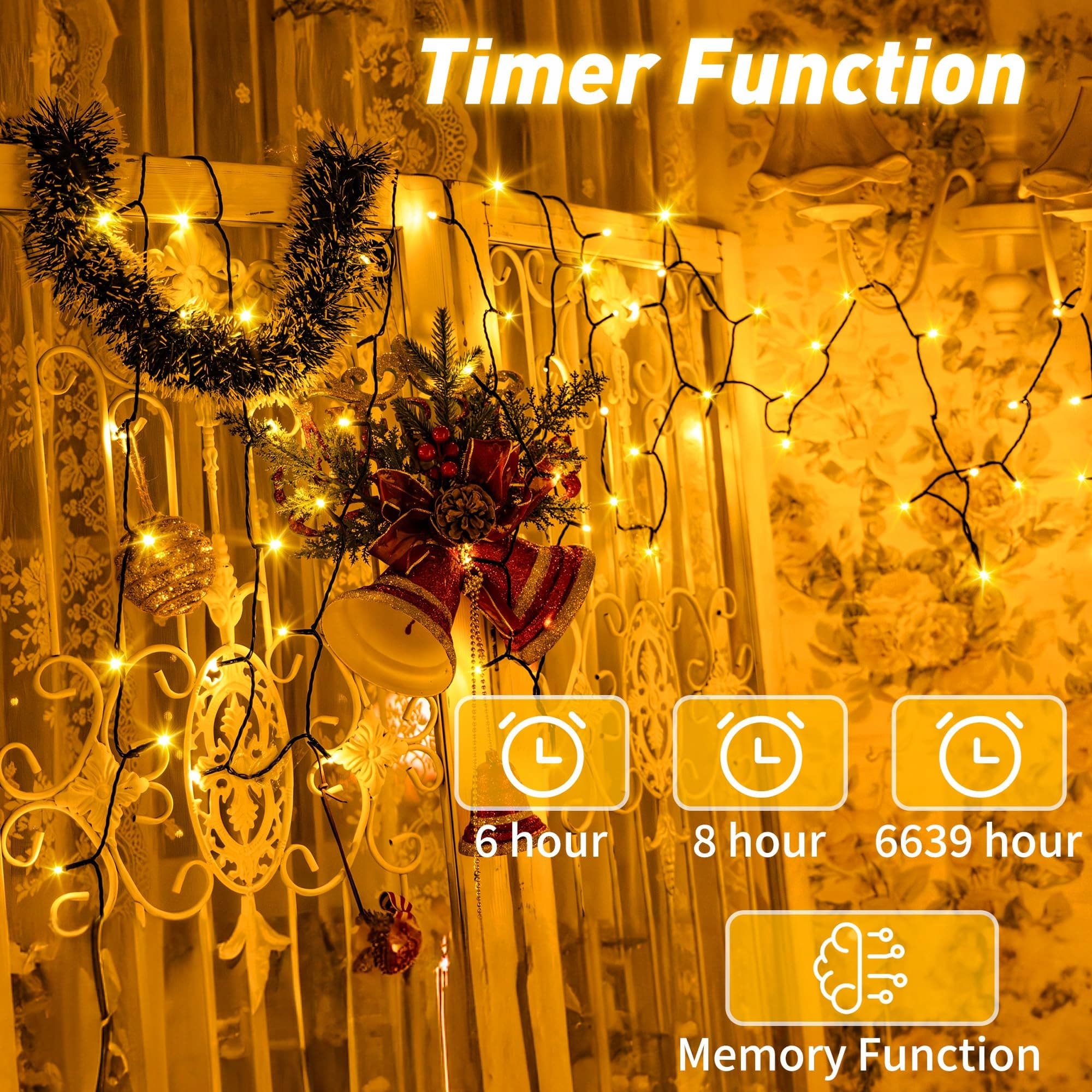 3 timery i funkcje pamięci: łańcuch świetlny na zewnątrz ma 3 tryby timera. Po ustawieniu światła włączają się i wyłączają zgodnie z harmonogramem. Funkcja pamięci może zapamiętać tryb przed wyłączeniem, co jest bardzo oszczędne energetycznie i przyjazne dla środowiska oraz oszczędza czas. 60M łańcuch świetlny nadaje się do dekoracji dużych powierzchni dekoracyjnych, takich jak domy, ogrody, balkony itp.