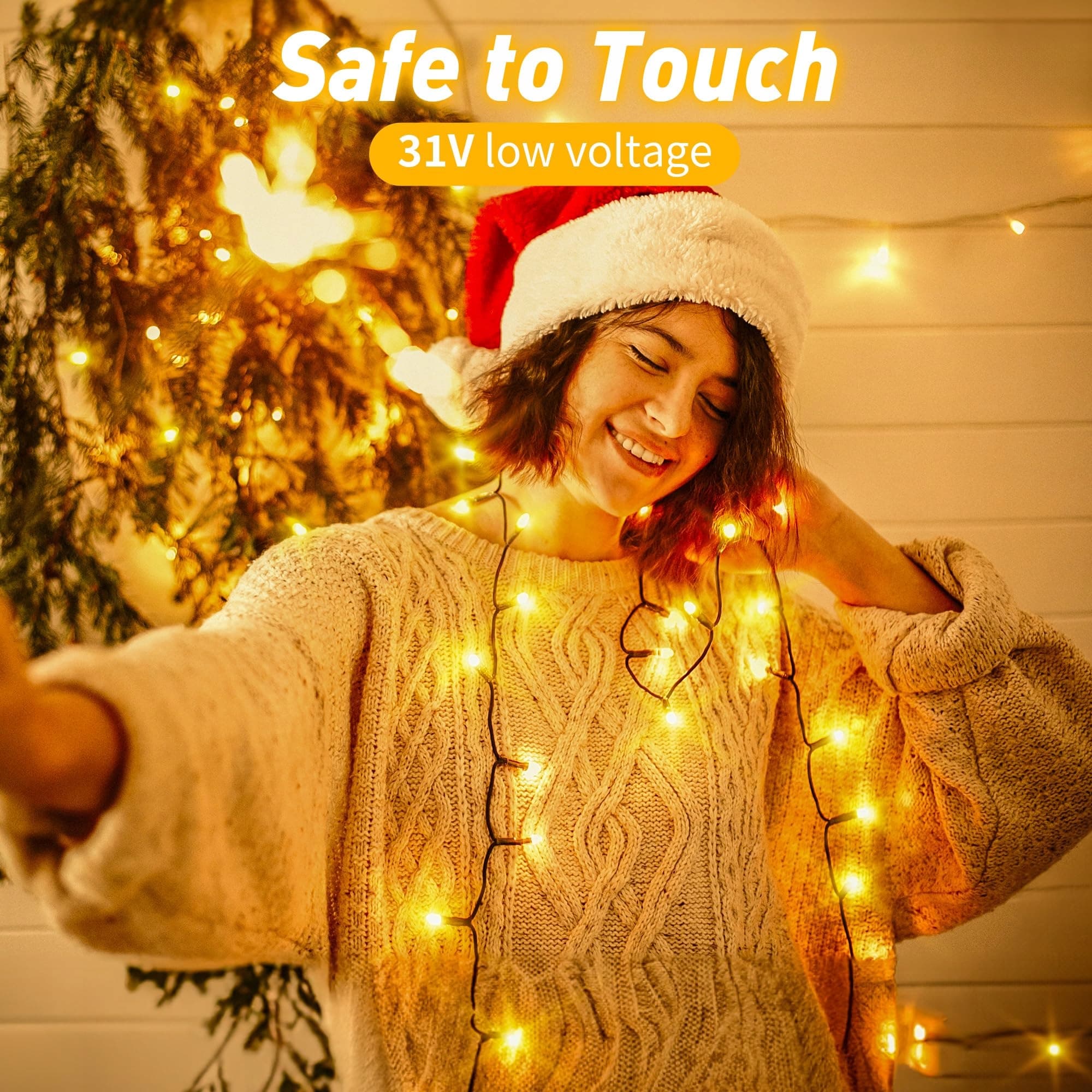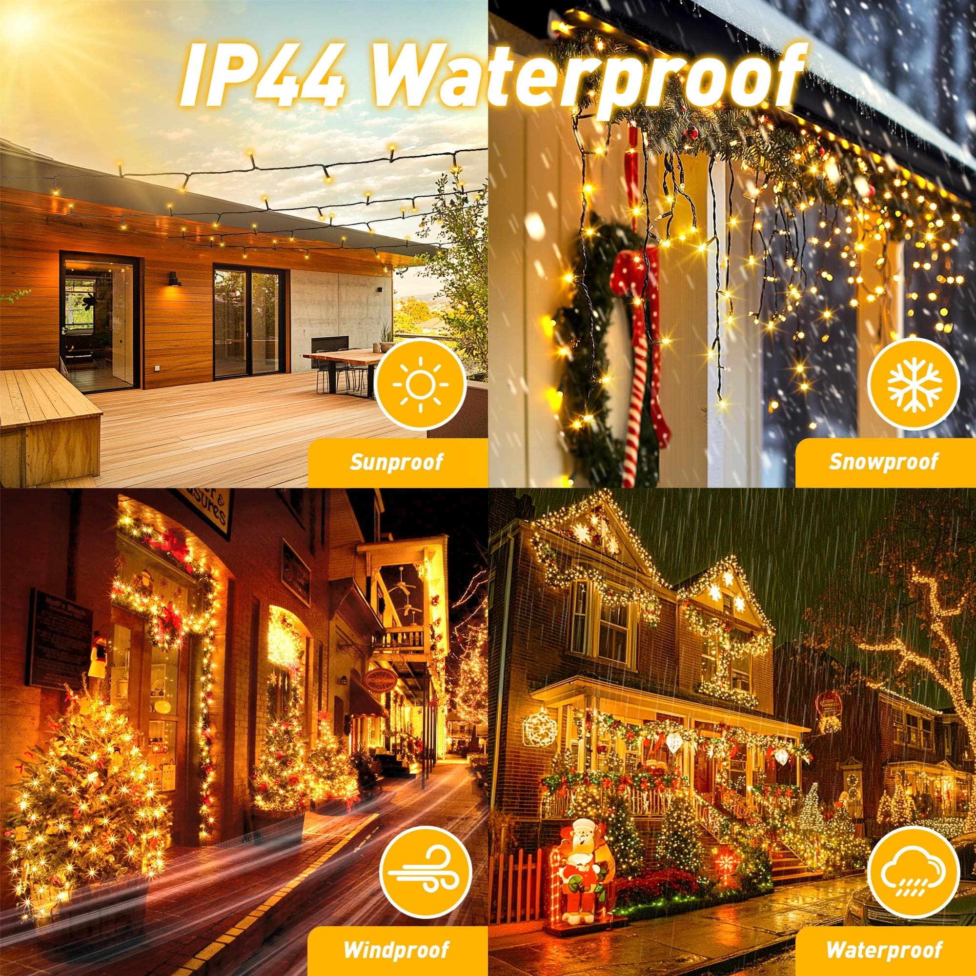 IP44 wodoodporny: łańcuch świetlny na święta jest pokryty wysokiej jakości zewnętrzną powłoką PVC, która może normalnie świecić w trudnych warunkach pogodowych, takich jak deszcz, śnieg, wiatr itp., tworząc świąteczną i pełną wydarzeń atmosferę w Twoim życiu, która nie jest zakłócona przez złe warunki pogodowe i jest idealną dekoracją na zewnątrz. Najlepszy wybór do balkonów, altan, ogrodów i dziedzińców