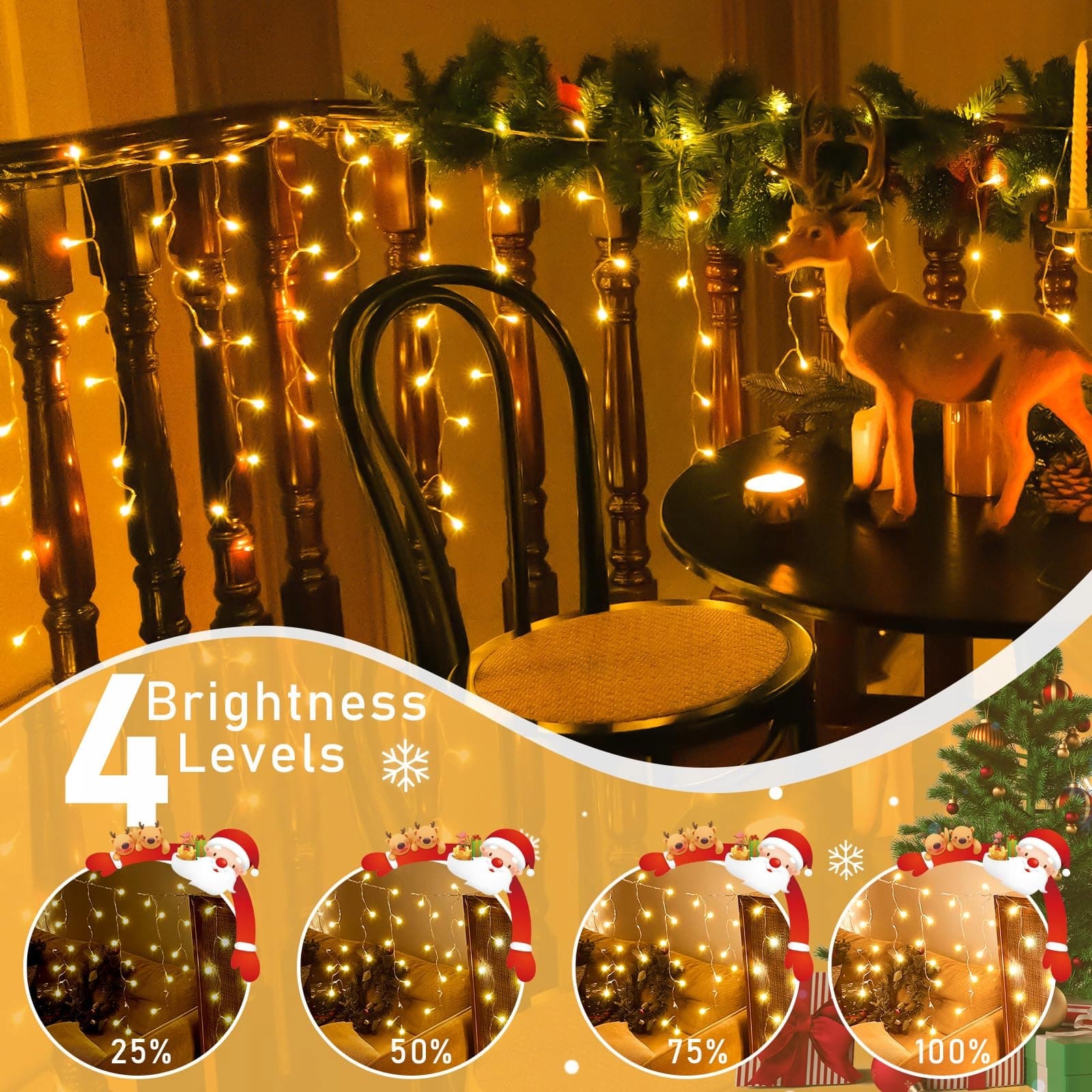 8 Modów i 4 Poziomy Jasności: Dzięki kombinacji 8 trybów świetlnych i 4 poziomom jasności, możesz za pomocą lichterkette eisregen stworzyć wiele przyjemnych efektów świetlnych. Jest to doskonały wybór, aby stworzyć różnorodne świąteczne atmosfery na swoim tarasie, balkonie lub w każdym innym miejscu na zewnątrz.