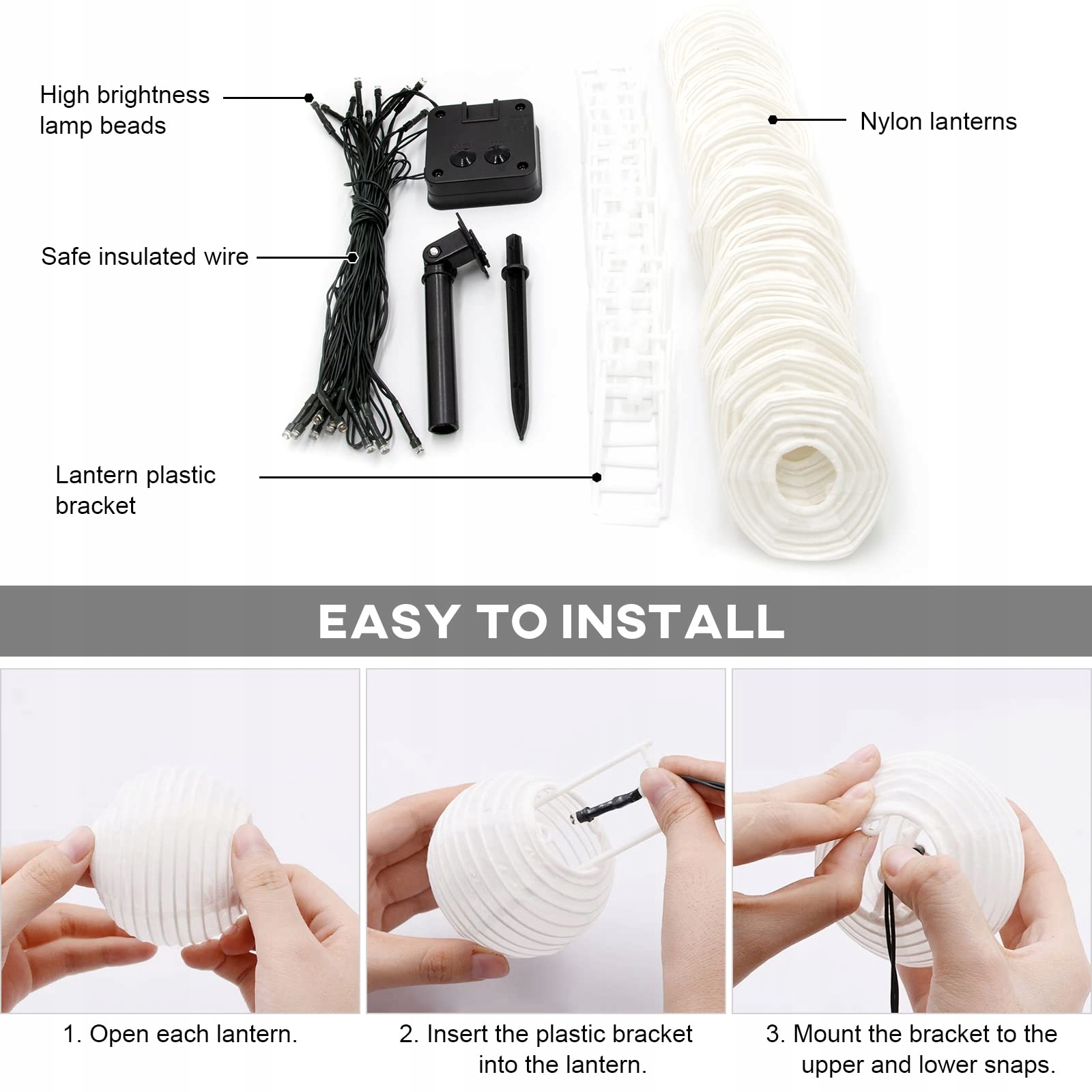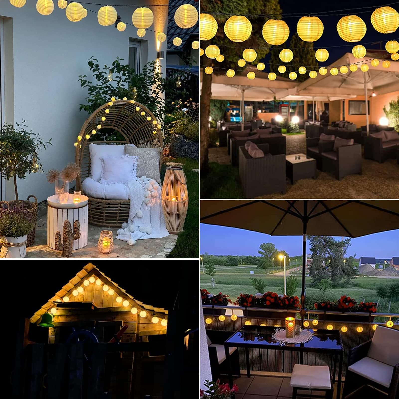 ✨20 Wysokiej jakości LED Laternen: Te dekoracyjne latarnie zewnętrzne wykonane są z nylonowej tkaniny, która jest bardziej elastyczna i wytrzymała, co pozwala na dłuższe użytkowanie. Wbudowana lampa LED jest wykonana przy użyciu nowej generacji technologii, co sprawia, że jasność jest bardziej komfortowa i cieplejsza, a żywotność dłuższa. Długość przewodu od panelu słonecznego do pierwszej latarni wynosi 2 m, odległość między latarniami wynosi 20 cm, a całkowita długość wynosi 6 m.