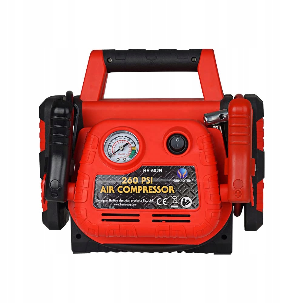 Jump Starter z inflatorem do opon. Ten inflator do opon o maksymalnym ciśnieniu 150psi (maksymalne dane eksperymentalne) napompuje standardową oponę samochodową w 3 minuty (195/65/R15, 0-35psi). Zawiera przedłużający wąż powietrzny i 3 różne adaptery do pompowania samochodów, motocykli, rowerów, piłek i innych nadmuchiwanych przedmiotów.
