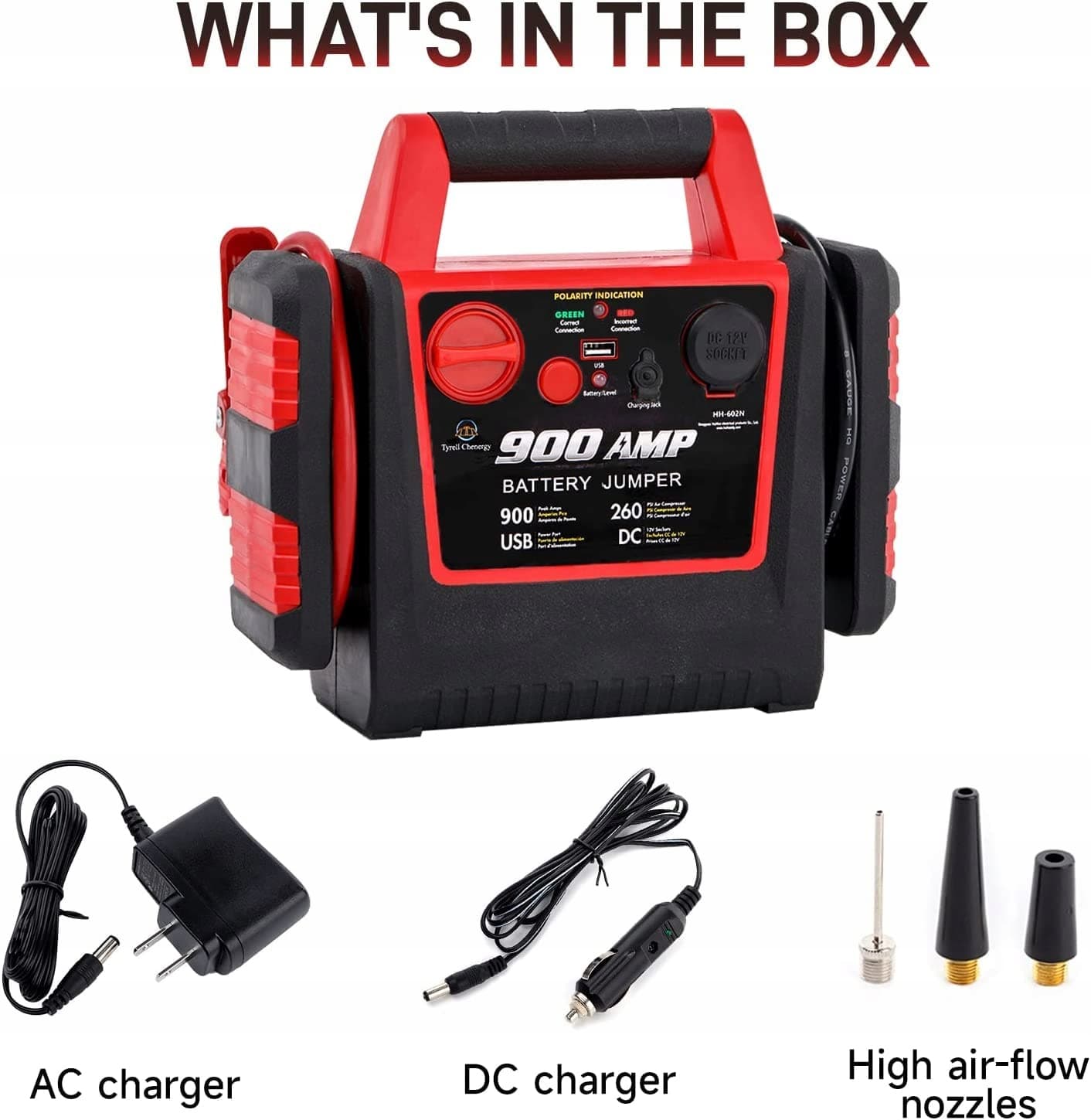 Co otrzymujesz: szybki starter z inflatorem do opon, wysokiej jakości zacisk do akumulatora, ładowarkę 110V AC, ładowarkę 12V DC, przedłużający wąż powietrzny, 3 adaptery, instrukcję obsługi