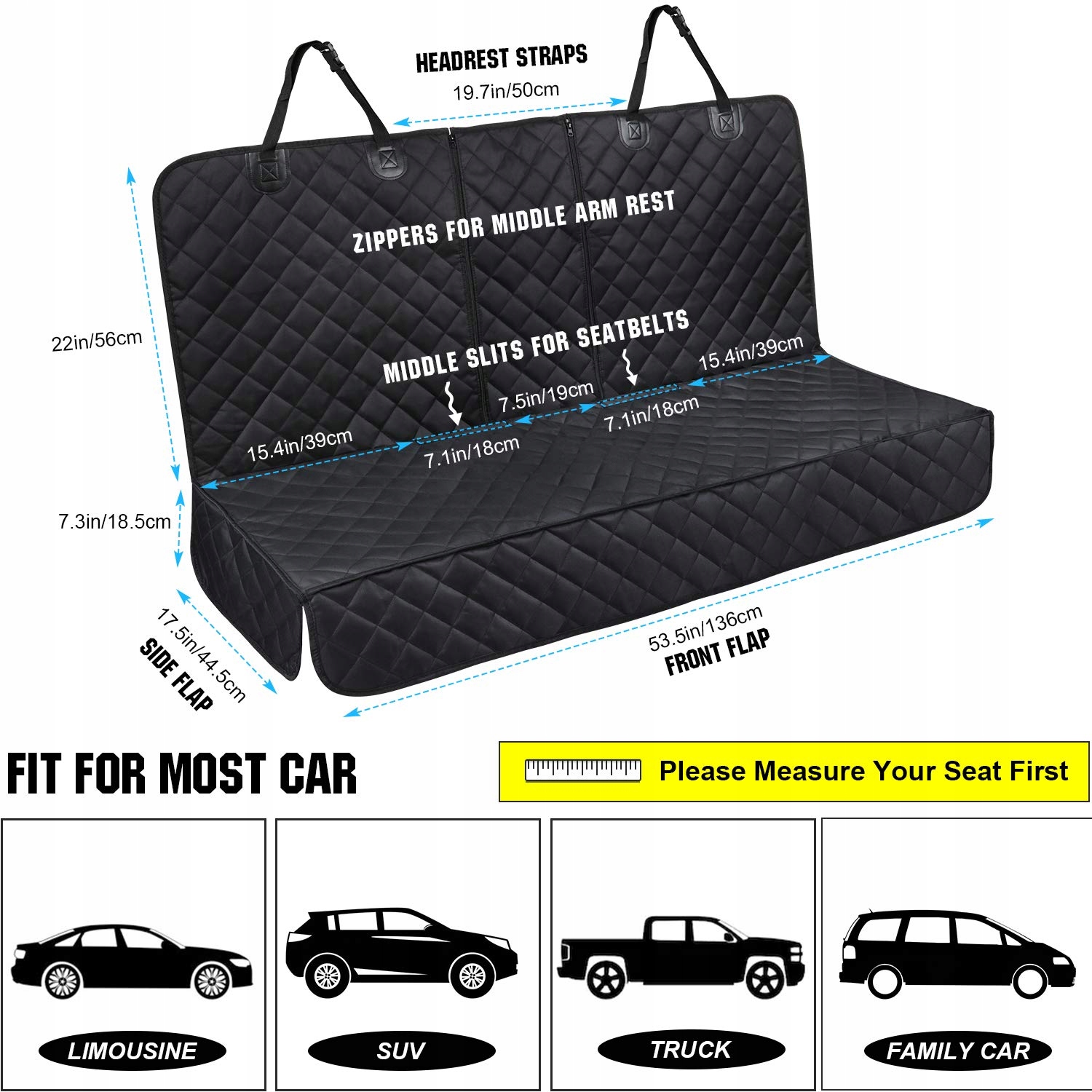 UNIWERSALNE DOPASOWANIE: Rozmiar pokrowca na siedzenie dla psa wynosi 137* 119 cm (54 "L: całkowicie rozłożona długość). Uniwersalnie pasuje do większości samochodów (3-drzwiowych/4-drzwiowych/5-drzwiowych) w tym zakresie rozmiarów na tylne siedzenia, SUV-y i MPV-y itp. Zalecamy potwierdzenie rozmiaru pokrowca na siedzenie dla psa w swoim samochodzie przed zakupem.