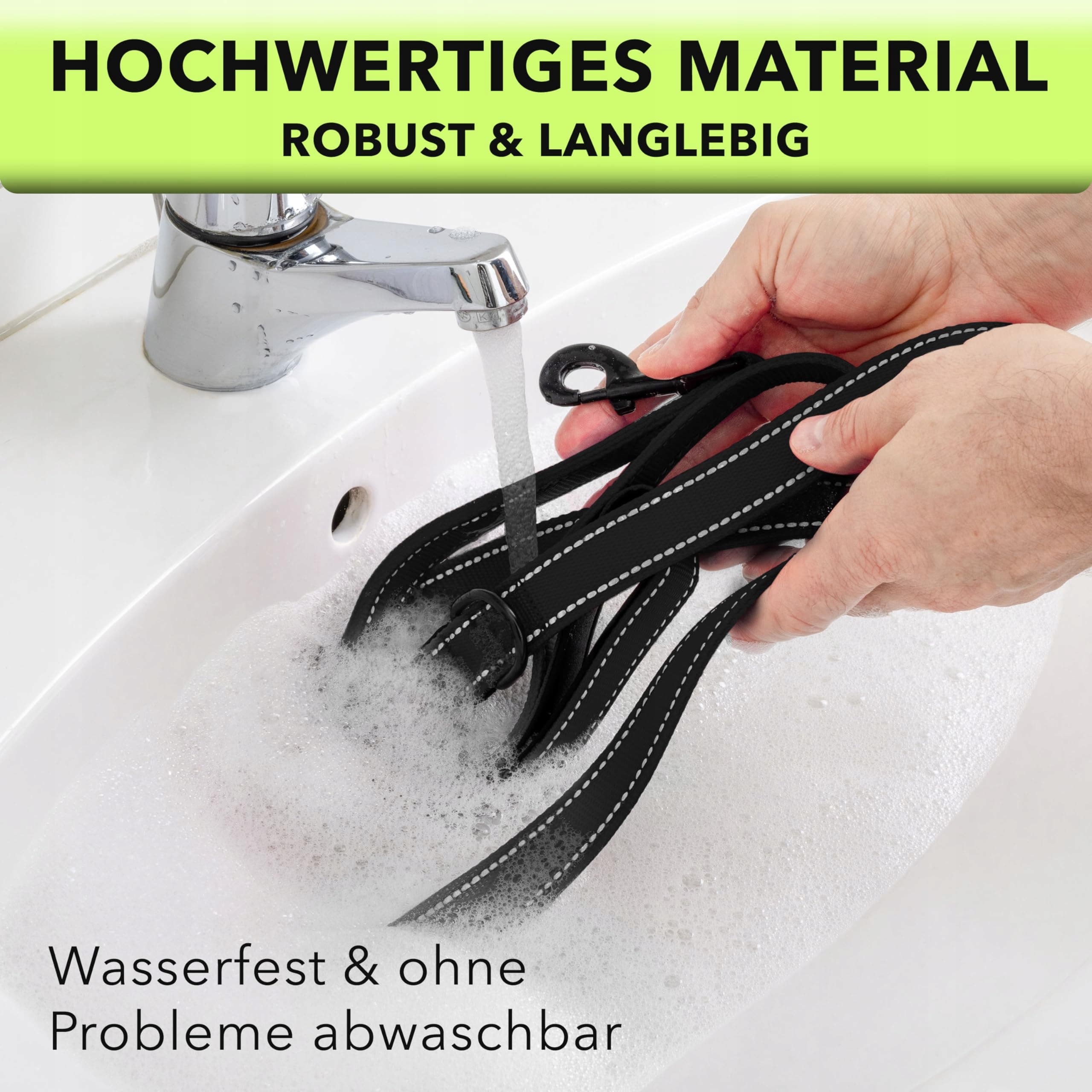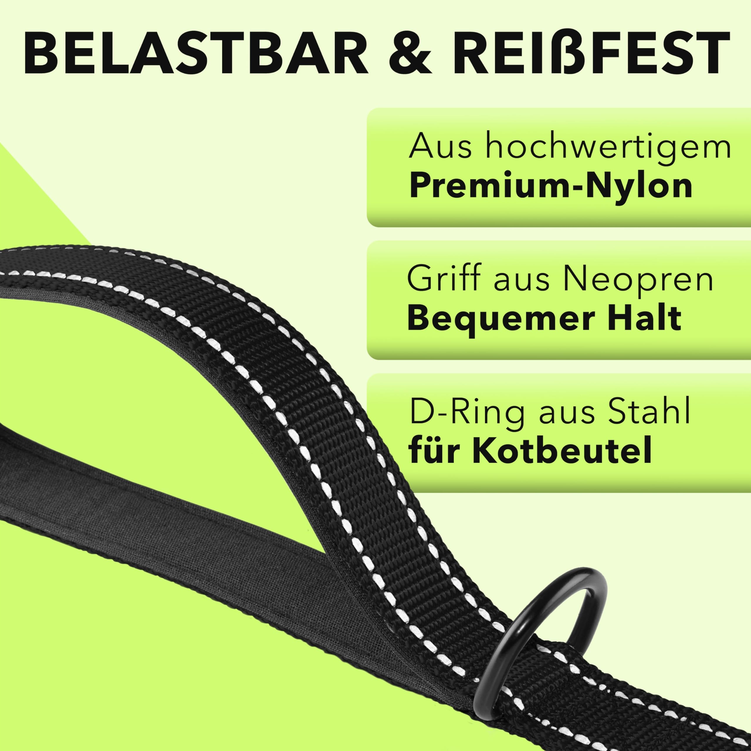 JAKOŚĆ I TRWAŁOŚĆ - Nasze wysokiej jakości odblaskowe smycze dla psów wykonane są z wyjątkowo kompaktowego i wytrzymałego nylonu. Dwa uchwyty są wyściełane miękkim neoprenem, a klamra + D-ring wykonane są z solidnego metalu. Długość smyczy wynosi 1,50 metra.