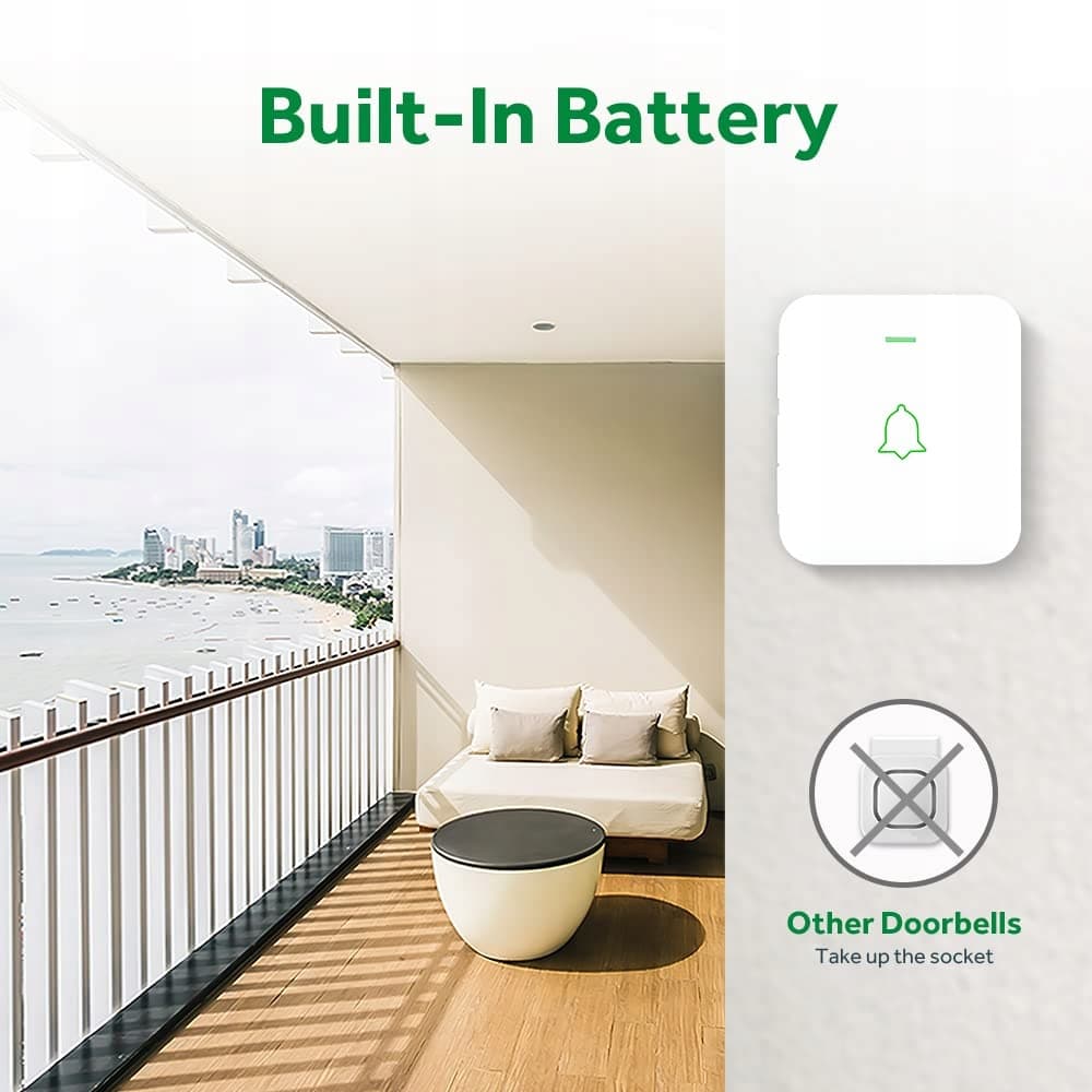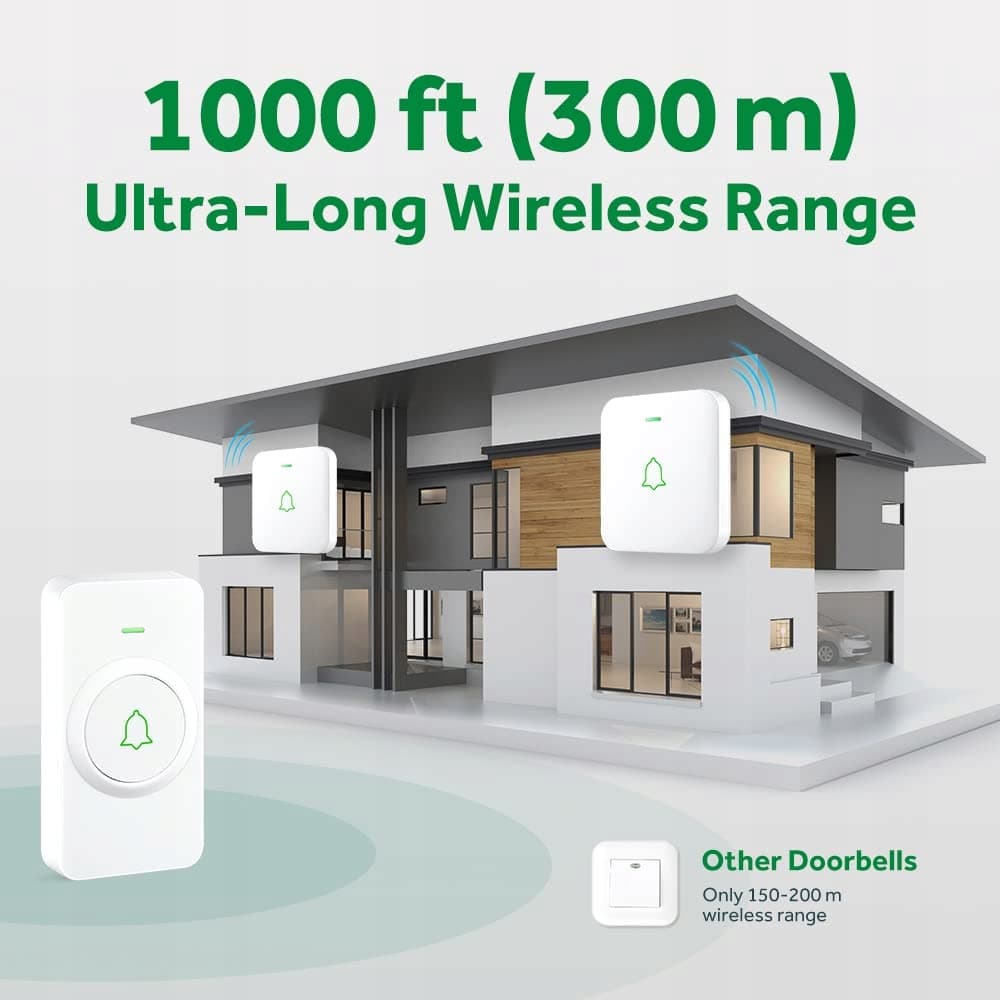 300 M / 1000 FT ULTRADŁUGI ZASIĘG BEZPRZEWODOWY: nie zakłóca innych urządzeń w Twoim domu ani u sąsiadów; zapewnia, że nigdy nie przegapisz gościa, nawet jeśli jesteś w kilku pokojach lub na innym piętrze