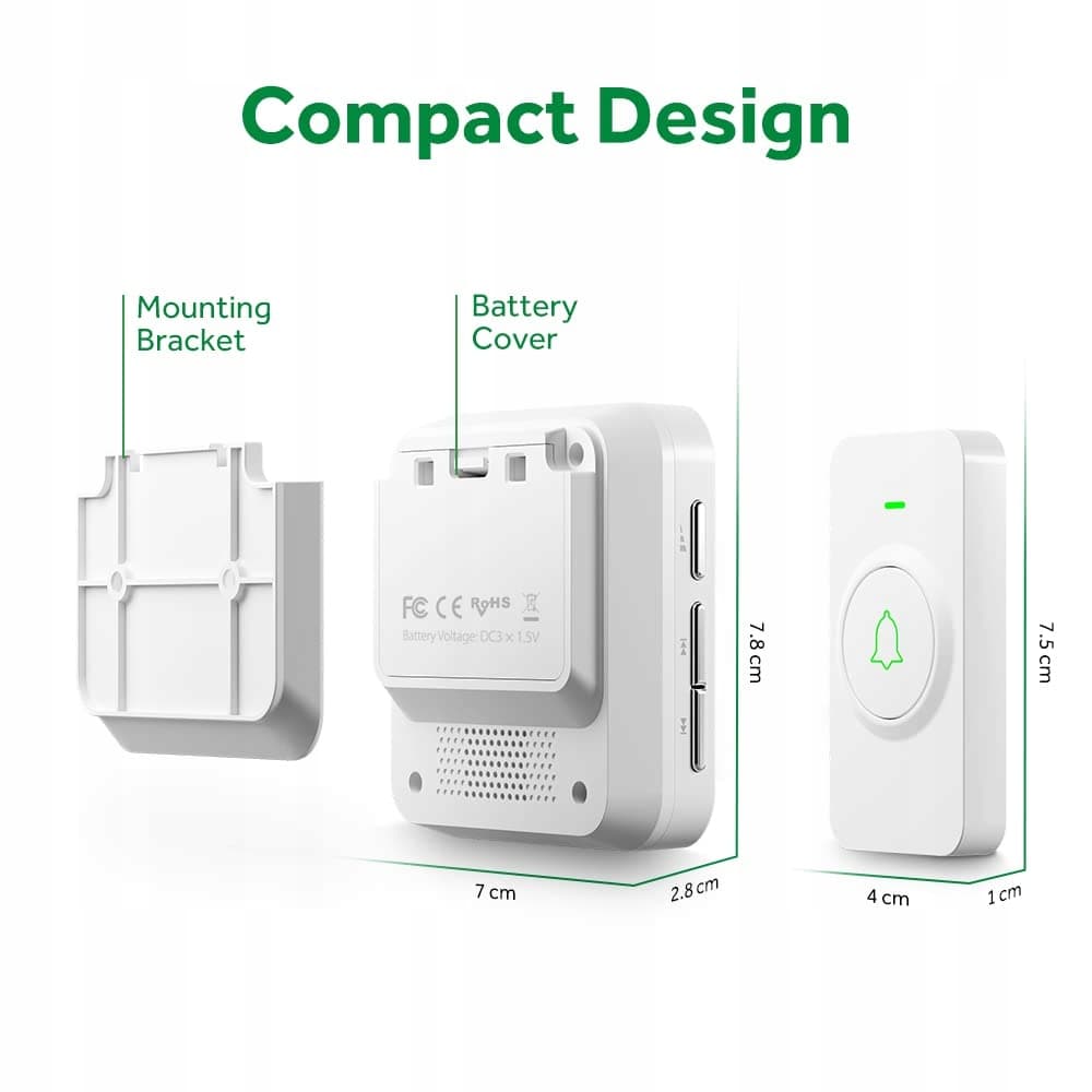 Wygodny odbiornik na baterie: Zasilany 3 bateriami AAA (w zestawie). Wystarczy przykręcić uchwyt montażowy do ściany i zawiesić odbiornik na [Nowa zawartość]. (Zestawy dzwonków do drzwi na baterie (BA-11/WA-11) mogą być łączone tylko z innymi zestawami dzwonków na baterie i nie pasują do innych zestawów lub akcesoriów w naszym sklepie.)