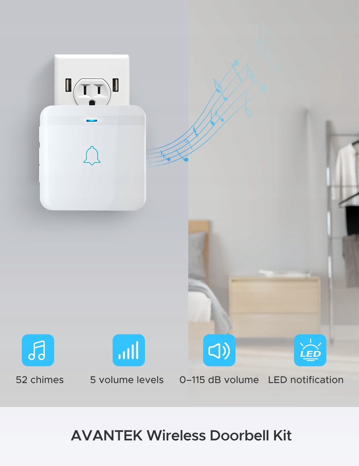Dzwonek bezprzewodowy, AVANTEK wodoodporny dzwonek bezprzewodowy z zasięgiem 400 m, 52 melodie, 5 poziomów głośności i migające diody LED