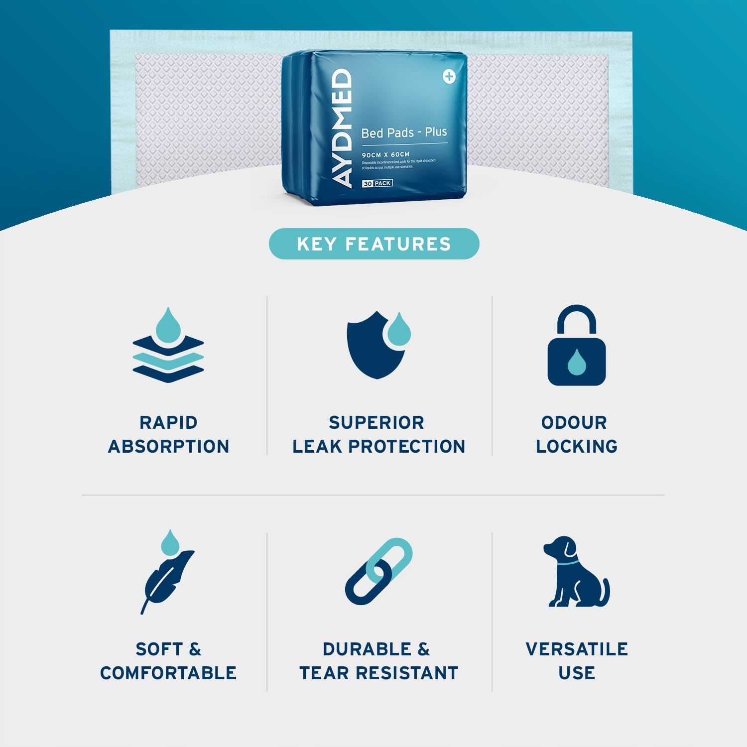 30 x Aydmed Premium jednorazowe podkłady na nietrzymanie moczu | Duże, wodoodporne i ultra chłonne ochraniacze na materac, sofę i krzesło dla niemowląt, dorosłych i osób starszych (60 cm x 90 cm)