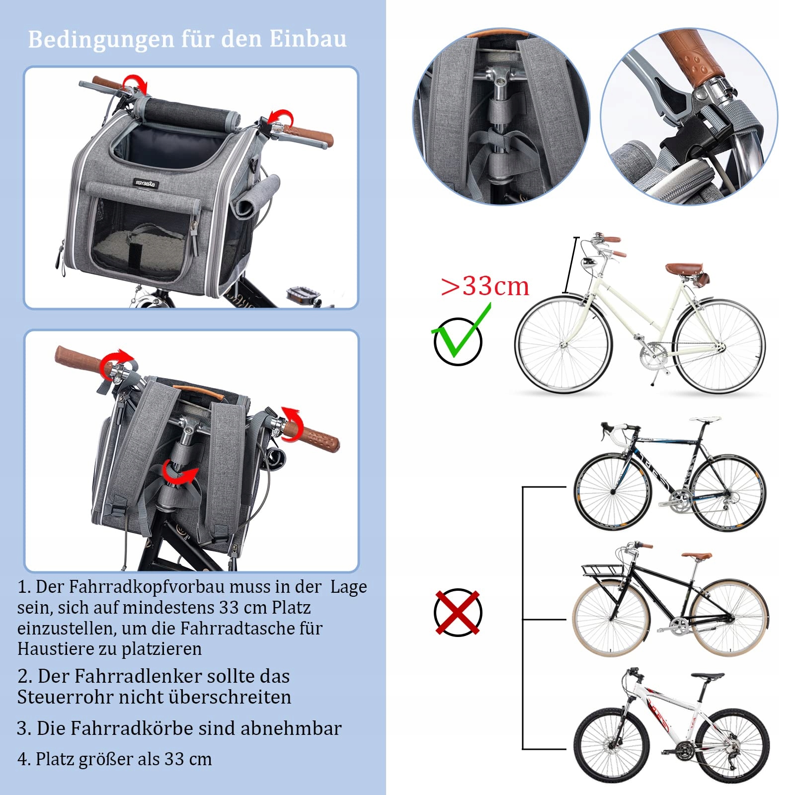 Szybka instalacja i demontaż: Prosty i wygodny design z szybkozłączką naszego koszyka rowerowego dla psa oraz paski na ramię mogą bezpośrednio przymocować nosidełko do kierownicy roweru, mocny rzep z tyłu sprawia, że jest stabilny i mocno trzyma się w pozycji koszyka rowerowego. Wymiary koszyka rowerowego dla psa: 31,5 CM x 26,5 CM x 31,5 CM. Wskazówki: Upewnij się, że waga Twojego psa mieści się w przedziale 3-7KG