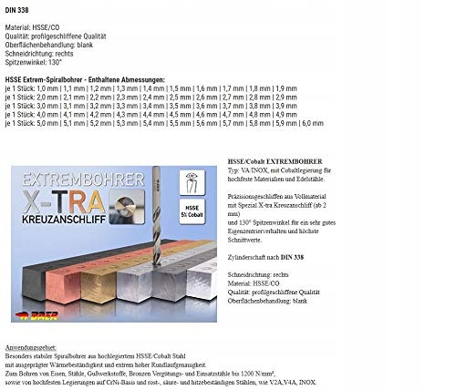 ZAWARTOŚĆ DOSTAWY - 51-częściowy zestaw ekstremalnych wierteł spiralnych HSSE, składający się z 1 sztuki od 1,0 mm do 6,0 mm (w krokach co 0,1 mm). Wykonany z HSSE/kobaltu z dodatkiem kobaltu, specjalnie zaprojektowany do obróbki wysokotwardych materiałów i stali szlachetnych, takich jak VA i INOX.