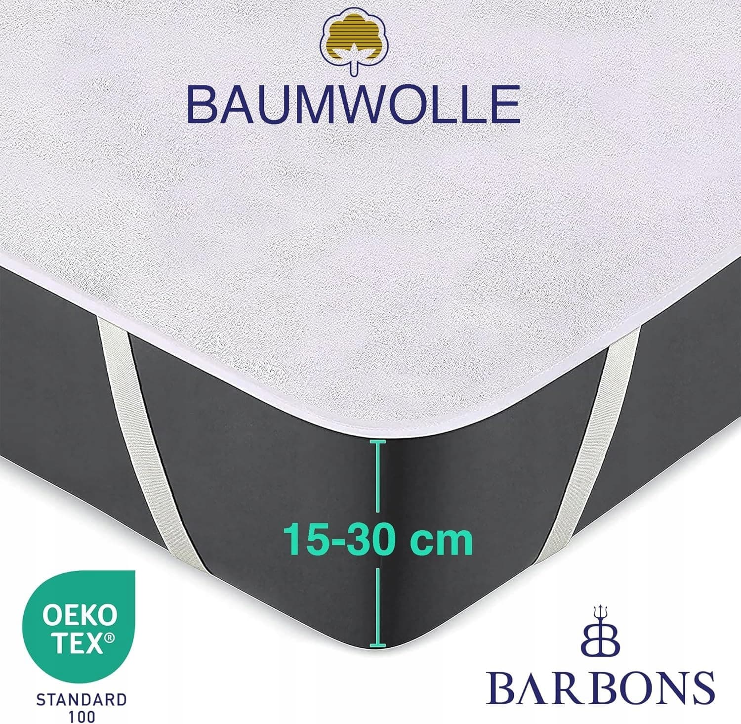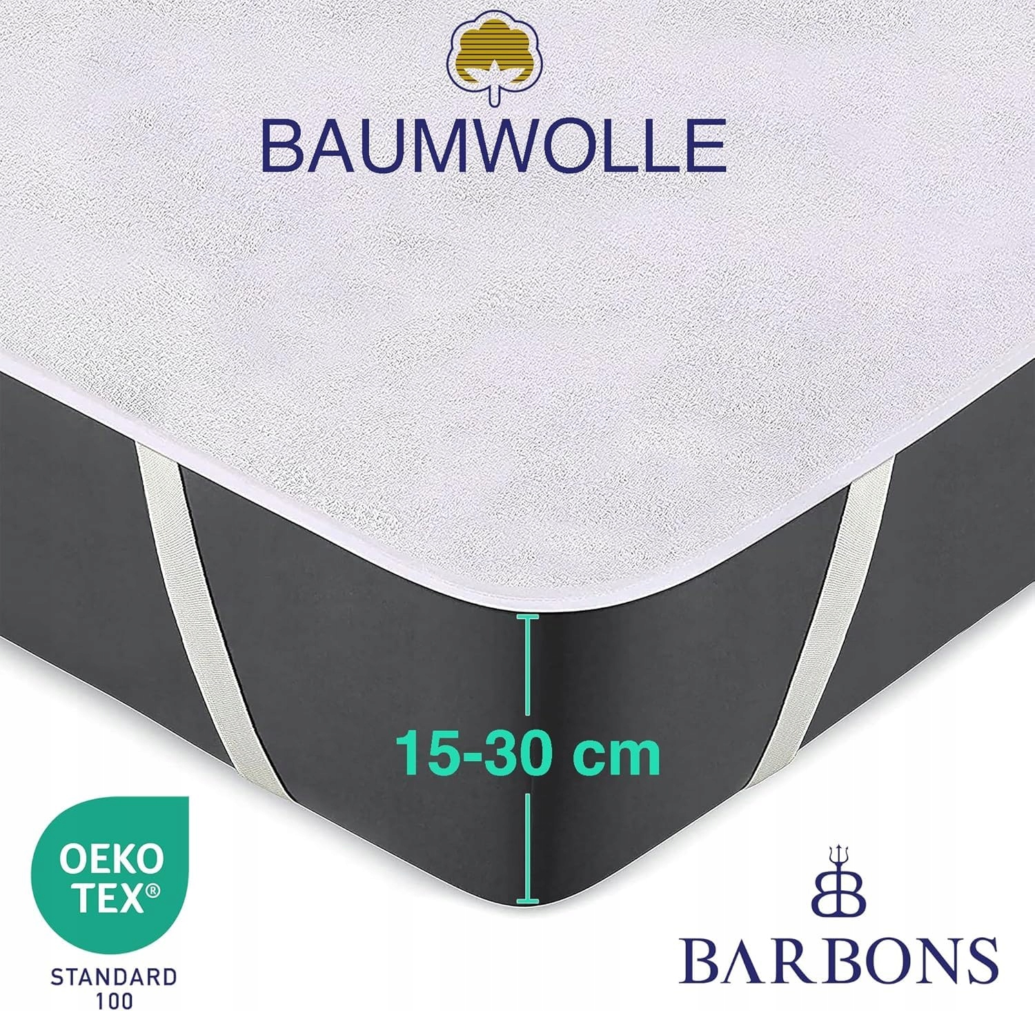 CERTYFIKOWANA JAKOŚĆ: Ochraniacz na materac BARBONS jest certyfikowany przez OEKO-TEX i wolny od substancji szkodliwych. Osoby starsze, dzieci i kobiety w ciąży mogą go zatem używać z pełnym zaufaniem. Dzięki miękkiej i przyjaznej dla skóry powierzchni z naturalnej bawełny oraz spodniej stronie z folii TPU, pokrowiec jest nie tylko w 100% wodoodporny, ale także oddychający.