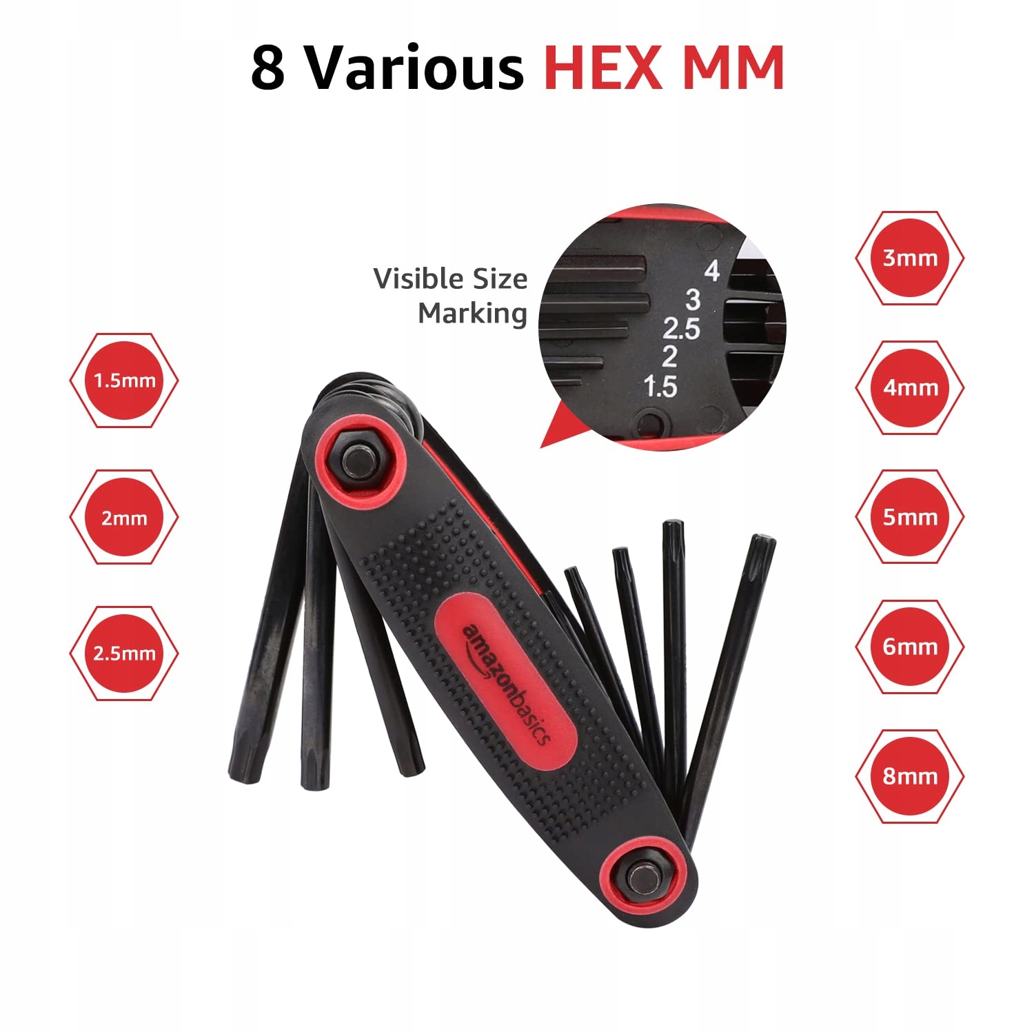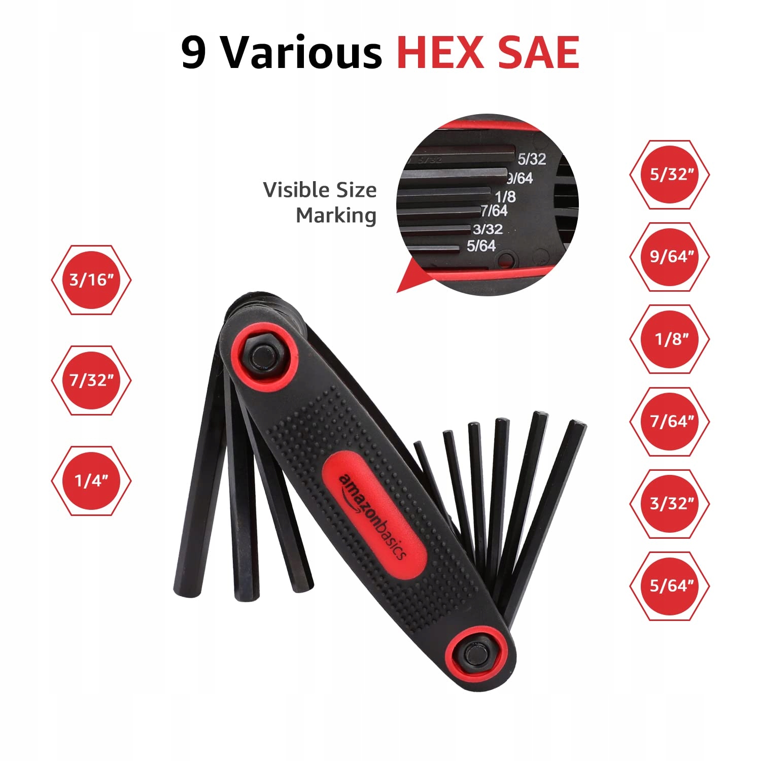 Zawiera 3 składane klucze sześciokątne wewnętrzne (znane również jako klucze imbusowe) do dokręcania lub luzowania śrub. Zawiera 9 rozmiarów SAE, 8 rozmiarów metrycznych i 8 rozmiarów Torx