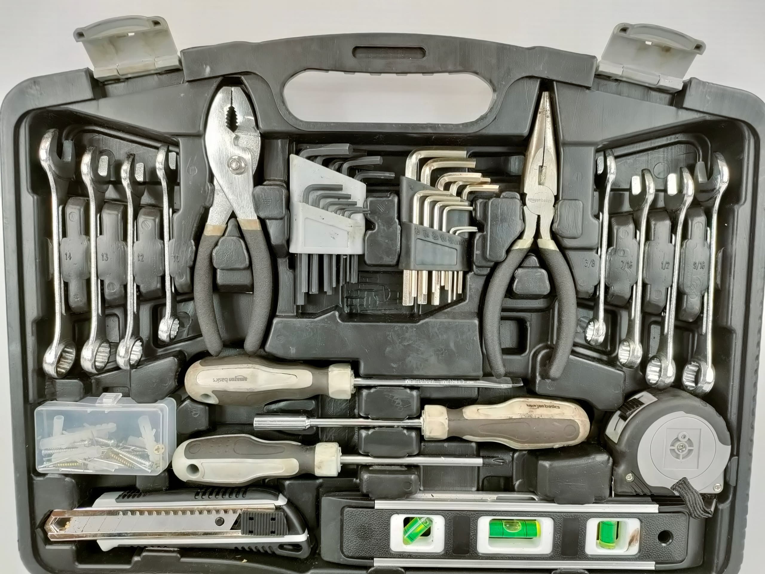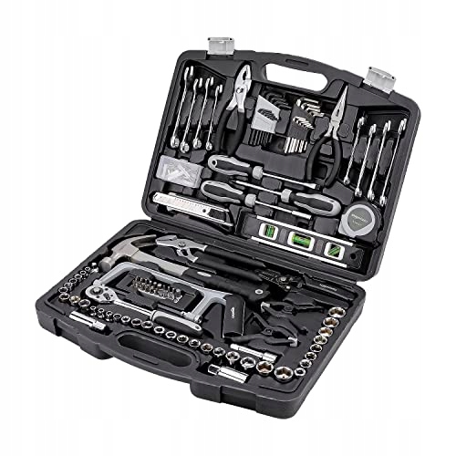 173-elementowy zestaw narzędzi ręcznych do podstawowych napraw w domu i projektów codziennych. Zawiera 8 x kluczy ringowych, klucz nasadowy 3/8 cala, 22 x kluczy imbusowych, 6-calową szczypce przegubowe, 6-calową szczypce wąskie i inne