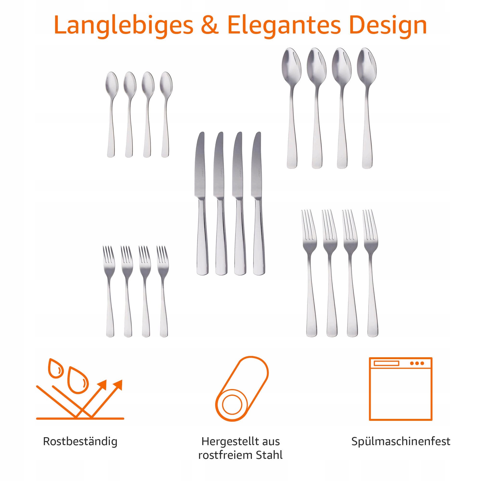 20-elementowy zestaw sztućców, dla 4 osób; zawiera 4 widelce do sałatek, 4 widelce do dań, 4 łyżeczki, 4 łyżki stołowe i 4 noże do dań