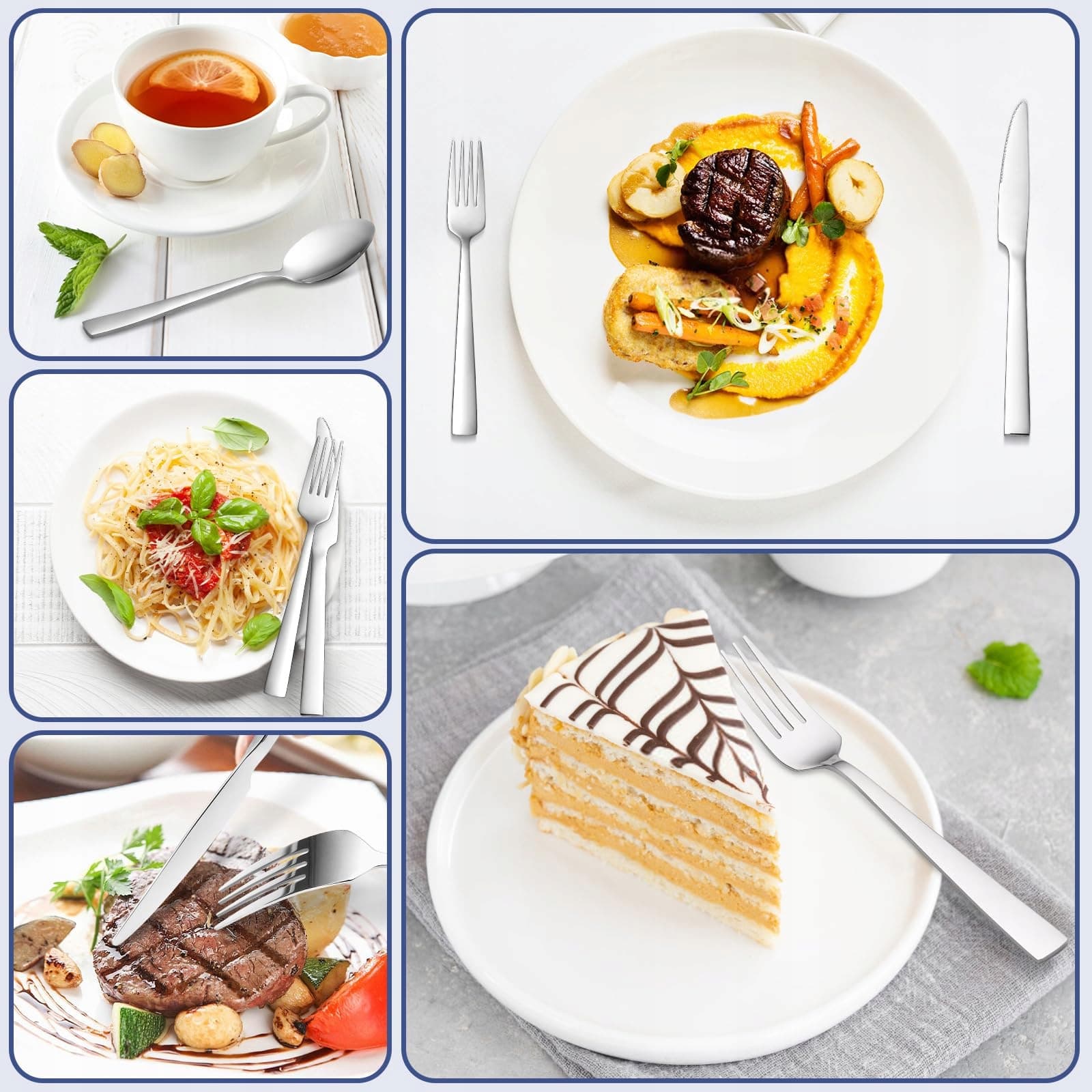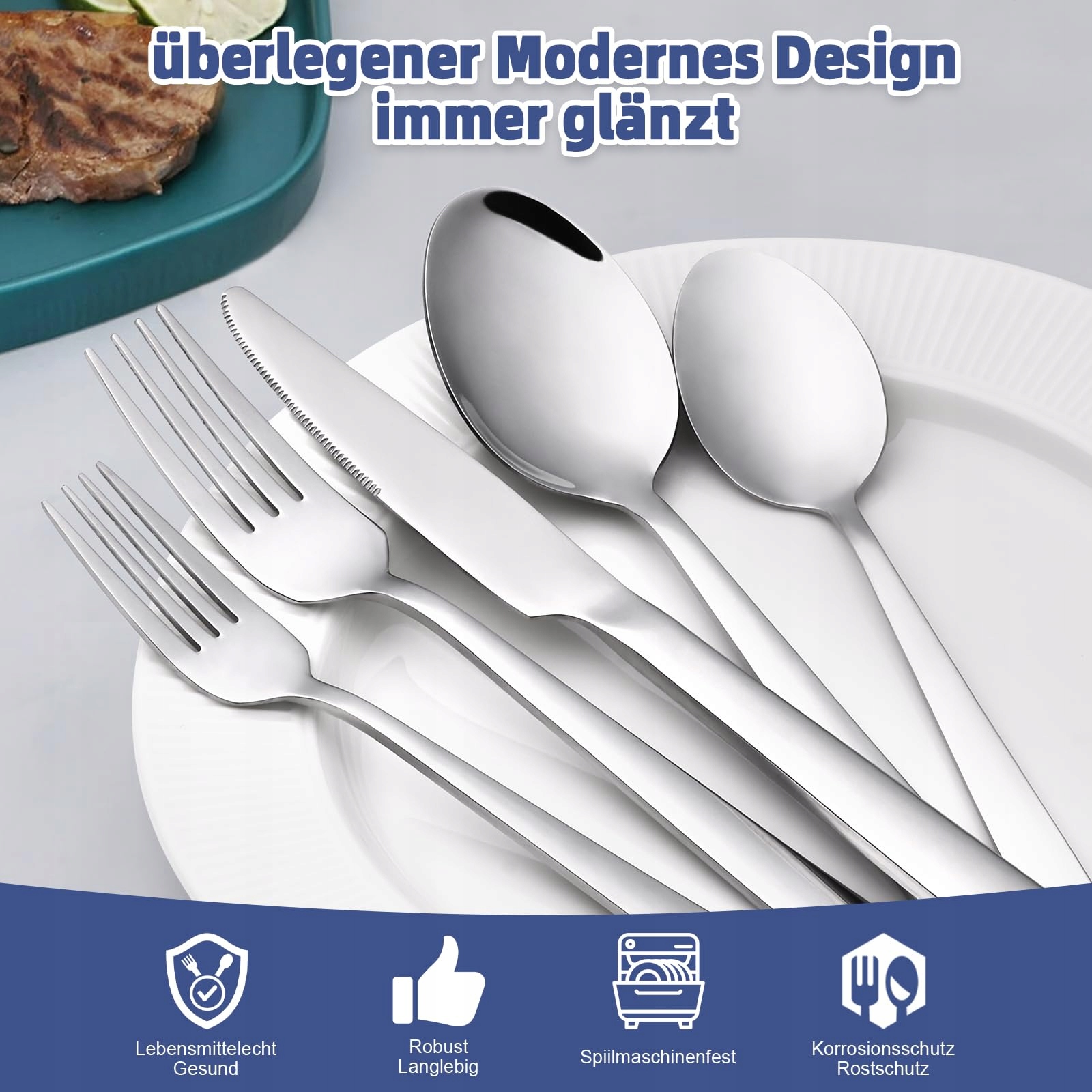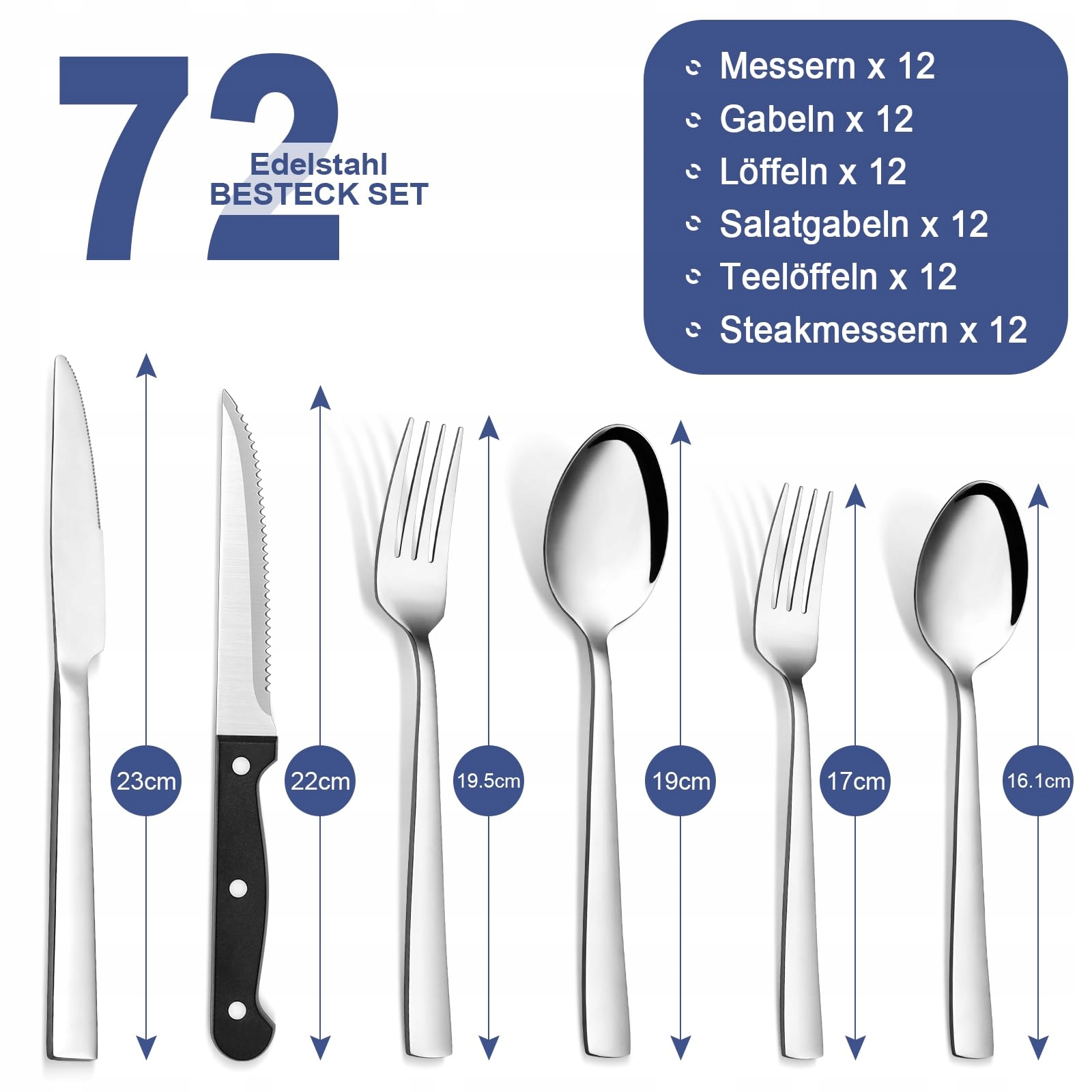 【Zestaw sztućców dla 12 osób】72-częściowy zestaw sztućców z 12 nożami do steków, składający się z 12 noży, 12 widelców, 12 łyżek, 12 widelców do sałatek, 12 łyżeczek, Ten srebrny zestaw sztućców spełnia wszystkie Twoje potrzeby kulinarne.