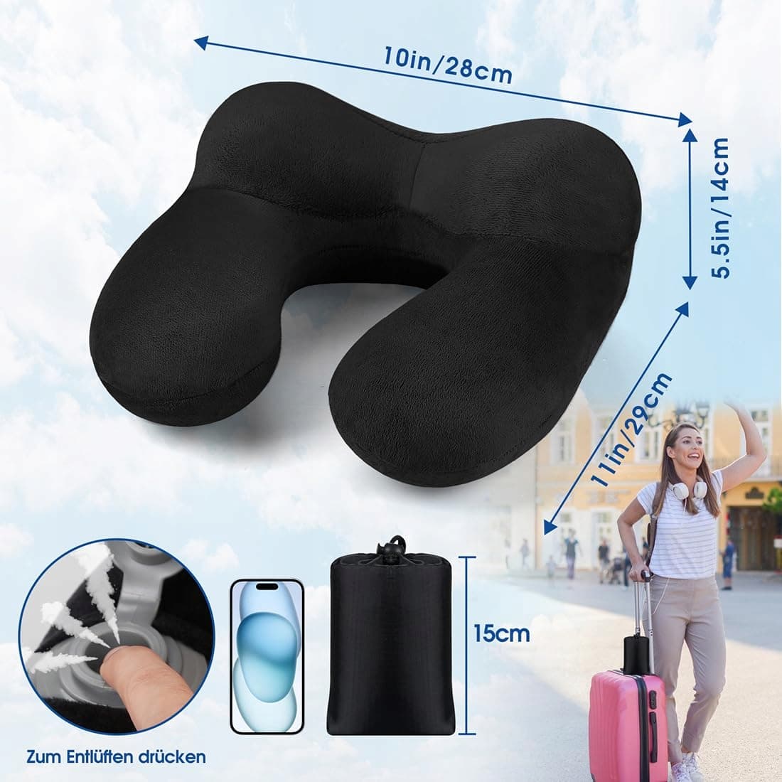 Poduszka podróżna, poduszka na szyję z funkcją nadmuchiwania do samolotu z zatyczkami do uszu, miękki welur ergonomiczna poduszka na szyję do biura, samolotu, samochodu, podróży, kempingu, poduszka do spania (czarna)